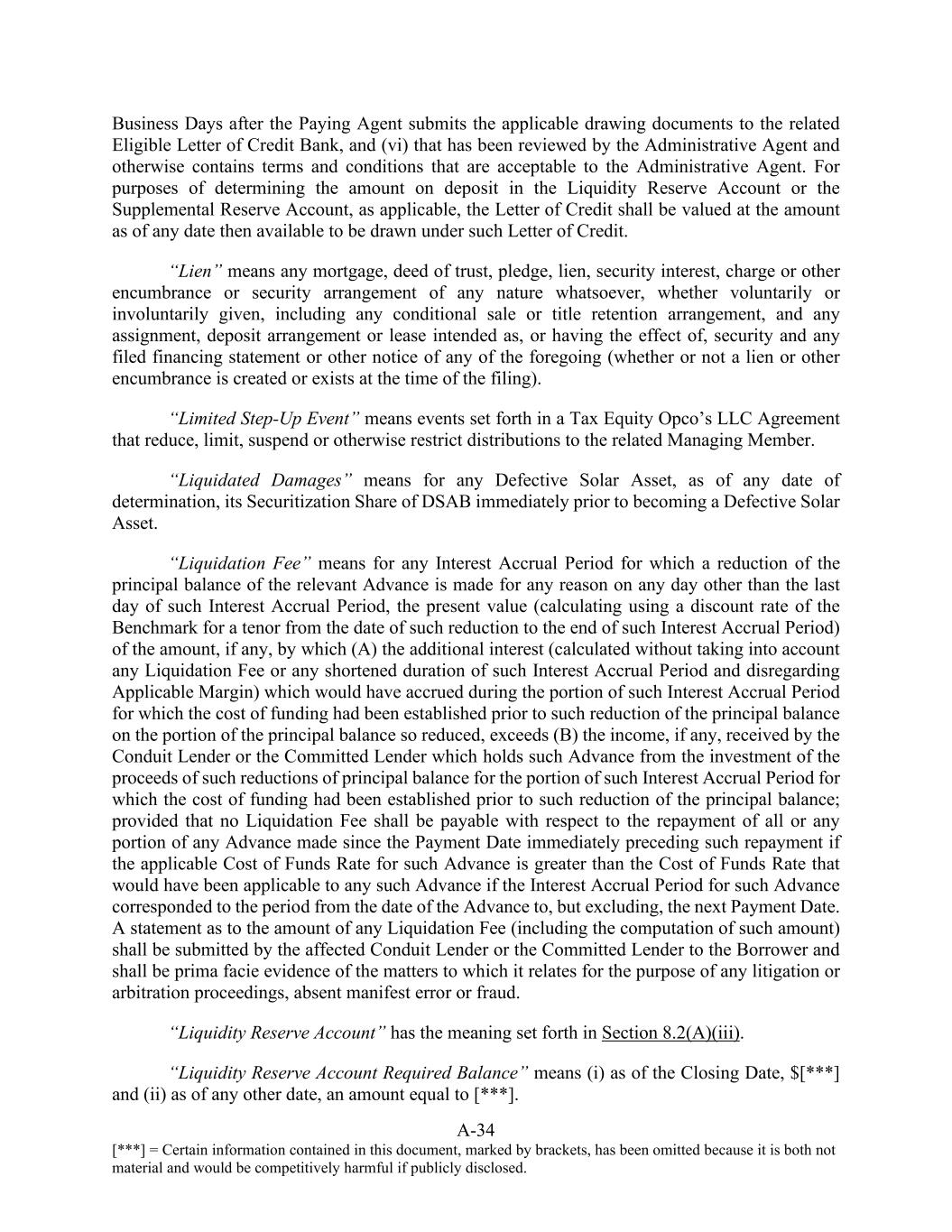 A-34 [***] = Certain information contained in this document, marked by brackets, has been omitted because it is both not material and would be competitively harmful if publicly disclosed. Business Days after the Paying Agent submits the applicable drawing documents to the related Eligible Letter of Credit Bank, and (vi) that has been reviewed by the Administrative Agent and otherwise contains terms and conditions that are acceptable to the Administrative Agent. For purposes of determining the amount on deposit in the Liquidity Reserve Account or the Supplemental Reserve Account, as applicable, the Letter of Credit shall be valued at the amount as of any date then available to be drawn under such Letter of Credit. “Lien” means any mortgage, deed of trust, pledge, lien, security interest, charge or other encumbrance or security arrangement of any nature whatsoever, whether voluntarily or involuntarily given, including any conditional sale or title retention arrangement, and any assignment, deposit arrangement or lease intended as, or having the effect of, security and any filed financing statement or other notice of any of the foregoing (whether or not a lien or other encumbrance is created or exists at the time of the filing). “Limited Step-Up Event” means events set forth in a Tax Equity Opco’s LLC Agreement that reduce, limit, suspend or otherwise restrict distributions to the related Managing Member. “Liquidated Damages” means for any Defective Solar Asset, as of any date of determination, its Securitization Share of DSAB immediately prior to becoming a Defective Solar Asset. “Liquidation Fee” means for any Interest Accrual Period for which a reduction of the principal balance of the relevant Advance is made for any reason on any day other than the last day of such Interest Accrual Period, the present value (calculating using a discount rate of the Benchmark for a tenor from the date of such reduction to the end of such Interest Accrual Period) of the amount, if any, by which (A) the additional interest (calculated without taking into account any Liquidation Fee or any shortened duration of such Interest Accrual Period and disregarding Applicable Margin) which would have accrued during the portion of such Interest Accrual Period for which the cost of funding had been established prior to such reduction of the principal balance on the portion of the principal balance so reduced, exceeds (B) the income, if any, received by the Conduit Lender or the Committed Lender which holds such Advance from the investment of the proceeds of such reductions of principal balance for the portion of such Interest Accrual Period for which the cost of funding had been established prior to such reduction of the principal balance; provided that no Liquidation Fee shall be payable with respect to the repayment of all or any portion of any Advance made since the Payment Date immediately preceding such repayment if the applicable Cost of Funds Rate for such Advance is greater than the Cost of Funds Rate that would have been applicable to any such Advance if the Interest Accrual Period for such Advance corresponded to the period from the date of the Advance to, but excluding, the next Payment Date. A statement as to the amount of any Liquidation Fee (including the computation of such amount) shall be submitted by the affected Conduit Lender or the Committed Lender to the Borrower and shall be prima facie evidence of the matters to which it relates for the purpose of any litigation or arbitration proceedings, absent manifest error or fraud. “Liquidity Reserve Account” has the meaning set forth in Section 8.2(A)(iii). “Liquidity Reserve Account Required Balance” means (i) as of the Closing Date, $[***] and (ii) as of any other date, an amount equal to [***].