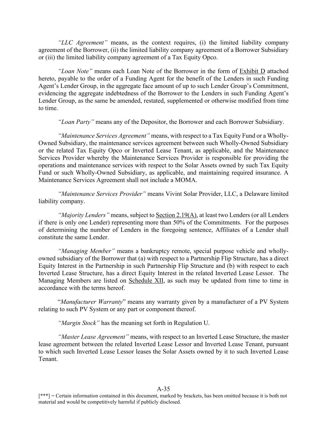 A-35 [***] = Certain information contained in this document, marked by brackets, has been omitted because it is both not material and would be competitively harmful if publicly disclosed. “LLC Agreement” means, as the context requires, (i) the limited liability company agreement of the Borrower, (ii) the limited liability company agreement of a Borrower Subsidiary or (iii) the limited liability company agreement of a Tax Equity Opco. “Loan Note” means each Loan Note of the Borrower in the form of Exhibit D attached hereto, payable to the order of a Funding Agent for the benefit of the Lenders in such Funding Agent’s Lender Group, in the aggregate face amount of up to such Lender Group’s Commitment, evidencing the aggregate indebtedness of the Borrower to the Lenders in such Funding Agent’s Lender Group, as the same be amended, restated, supplemented or otherwise modified from time to time. “Loan Party” means any of the Depositor, the Borrower and each Borrower Subsidiary. “Maintenance Services Agreement” means, with respect to a Tax Equity Fund or a Wholly- Owned Subsidiary, the maintenance services agreement between such Wholly-Owned Subsidiary or the related Tax Equity Opco or Inverted Lease Tenant, as applicable, and the Maintenance Services Provider whereby the Maintenance Services Provider is responsible for providing the operations and maintenance services with respect to the Solar Assets owned by such Tax Equity Fund or such Wholly-Owned Subsidiary, as applicable, and maintaining required insurance. A Maintenance Services Agreement shall not include a MOMA. “Maintenance Services Provider” means Vivint Solar Provider, LLC, a Delaware limited liability company. “Majority Lenders” means, subject to Section 2.19(A), at least two Lenders (or all Lenders if there is only one Lender) representing more than 50% of the Commitments. For the purposes of determining the number of Lenders in the foregoing sentence, Affiliates of a Lender shall constitute the same Lender. “Managing Member” means a bankruptcy remote, special purpose vehicle and wholly- owned subsidiary of the Borrower that (a) with respect to a Partnership Flip Structure, has a direct Equity Interest in the Partnership in such Partnership Flip Structure and (b) with respect to each Inverted Lease Structure, has a direct Equity Interest in the related Inverted Lease Lessor. The Managing Members are listed on Schedule XII, as such may be updated from time to time in accordance with the terms hereof. “Manufacturer Warranty” means any warranty given by a manufacturer of a PV System relating to such PV System or any part or component thereof. “Margin Stock” has the meaning set forth in Regulation U. “Master Lease Agreement” means, with respect to an Inverted Lease Structure, the master lease agreement between the related Inverted Lease Lessor and Inverted Lease Tenant, pursuant to which such Inverted Lease Lessor leases the Solar Assets owned by it to such Inverted Lease Tenant.