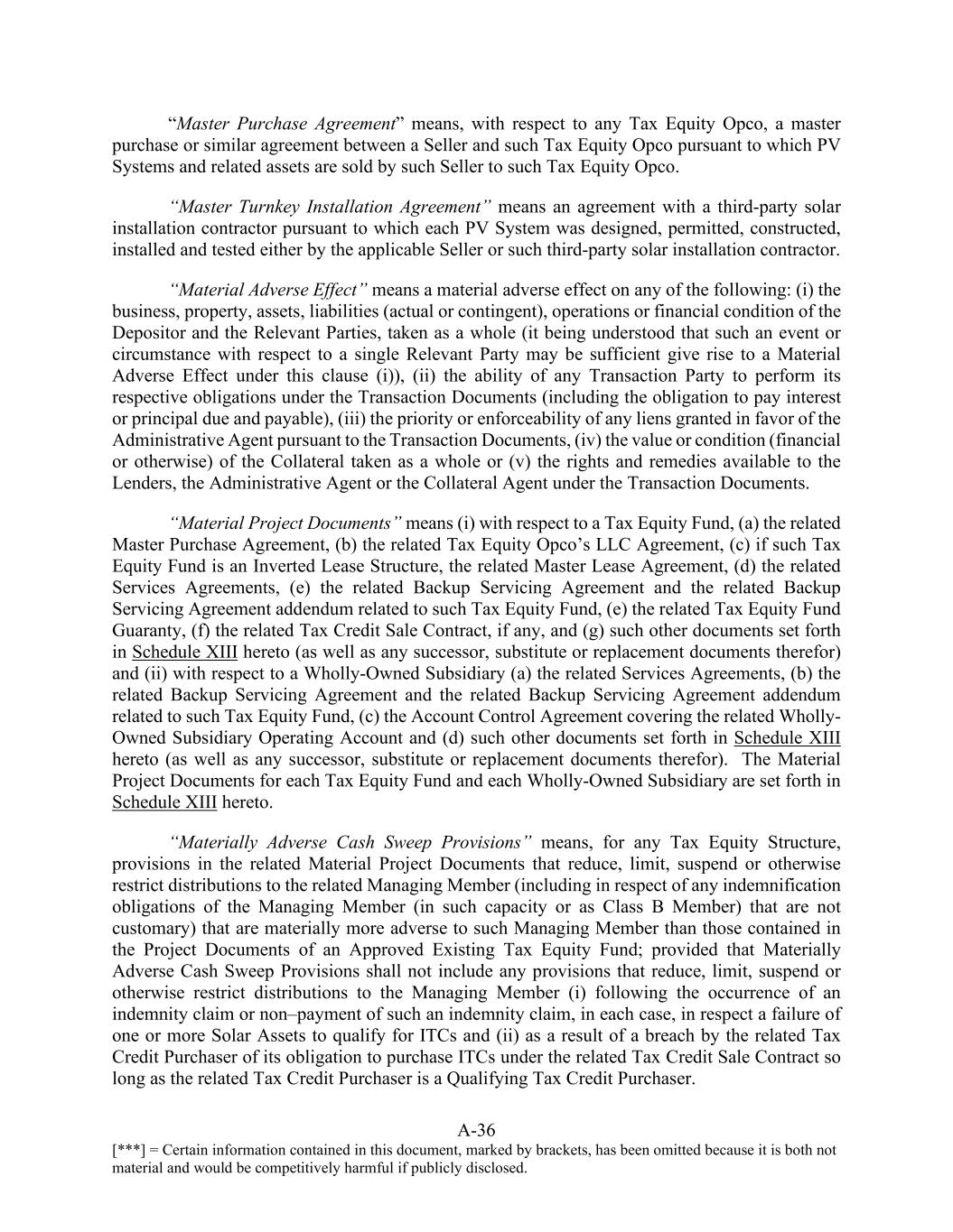 A-36 [***] = Certain information contained in this document, marked by brackets, has been omitted because it is both not material and would be competitively harmful if publicly disclosed. “Master Purchase Agreement” means, with respect to any Tax Equity Opco, a master purchase or similar agreement between a Seller and such Tax Equity Opco pursuant to which PV Systems and related assets are sold by such Seller to such Tax Equity Opco. “Master Turnkey Installation Agreement” means an agreement with a third-party solar installation contractor pursuant to which each PV System was designed, permitted, constructed, installed and tested either by the applicable Seller or such third-party solar installation contractor. “Material Adverse Effect” means a material adverse effect on any of the following: (i) the business, property, assets, liabilities (actual or contingent), operations or financial condition of the Depositor and the Relevant Parties, taken as a whole (it being understood that such an event or circumstance with respect to a single Relevant Party may be sufficient give rise to a Material Adverse Effect under this clause (i)), (ii) the ability of any Transaction Party to perform its respective obligations under the Transaction Documents (including the obligation to pay interest or principal due and payable), (iii) the priority or enforceability of any liens granted in favor of the Administrative Agent pursuant to the Transaction Documents, (iv) the value or condition (financial or otherwise) of the Collateral taken as a whole or (v) the rights and remedies available to the Lenders, the Administrative Agent or the Collateral Agent under the Transaction Documents. “Material Project Documents” means (i) with respect to a Tax Equity Fund, (a) the related Master Purchase Agreement, (b) the related Tax Equity Opco’s LLC Agreement, (c) if such Tax Equity Fund is an Inverted Lease Structure, the related Master Lease Agreement, (d) the related Services Agreements, (e) the related Backup Servicing Agreement and the related Backup Servicing Agreement addendum related to such Tax Equity Fund, (e) the related Tax Equity Fund Guaranty, (f) the related Tax Credit Sale Contract, if any, and (g) such other documents set forth in Schedule XIII hereto (as well as any successor, substitute or replacement documents therefor) and (ii) with respect to a Wholly-Owned Subsidiary (a) the related Services Agreements, (b) the related Backup Servicing Agreement and the related Backup Servicing Agreement addendum related to such Tax Equity Fund, (c) the Account Control Agreement covering the related Wholly- Owned Subsidiary Operating Account and (d) such other documents set forth in Schedule XIII hereto (as well as any successor, substitute or replacement documents therefor). The Material Project Documents for each Tax Equity Fund and each Wholly-Owned Subsidiary are set forth in Schedule XIII hereto. “Materially Adverse Cash Sweep Provisions” means, for any Tax Equity Structure, provisions in the related Material Project Documents that reduce, limit, suspend or otherwise restrict distributions to the related Managing Member (including in respect of any indemnification obligations of the Managing Member (in such capacity or as Class B Member) that are not customary) that are materially more adverse to such Managing Member than those contained in the Project Documents of an Approved Existing Tax Equity Fund; provided that Materially Adverse Cash Sweep Provisions shall not include any provisions that reduce, limit, suspend or otherwise restrict distributions to the Managing Member (i) following the occurrence of an indemnity claim or non–payment of such an indemnity claim, in each case, in respect a failure of one or more Solar Assets to qualify for ITCs and (ii) as a result of a breach by the related Tax Credit Purchaser of its obligation to purchase ITCs under the related Tax Credit Sale Contract so long as the related Tax Credit Purchaser is a Qualifying Tax Credit Purchaser.