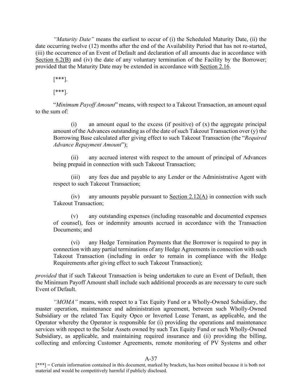 A-37 [***] = Certain information contained in this document, marked by brackets, has been omitted because it is both not material and would be competitively harmful if publicly disclosed. “Maturity Date” means the earliest to occur of (i) the Scheduled Maturity Date, (ii) the date occurring twelve (12) months after the end of the Availability Period that has not re-started, (iii) the occurrence of an Event of Default and declaration of all amounts due in accordance with Section 6.2(B) and (iv) the date of any voluntary termination of the Facility by the Borrower; provided that the Maturity Date may be extended in accordance with Section 2.16. [***]. [***]. “Minimum Payoff Amount” means, with respect to a Takeout Transaction, an amount equal to the sum of: (i) an amount equal to the excess (if positive) of (x) the aggregate principal amount of the Advances outstanding as of the date of such Takeout Transaction over (y) the Borrowing Base calculated after giving effect to such Takeout Transaction (the “Required Advance Repayment Amount”); (ii) any accrued interest with respect to the amount of principal of Advances being prepaid in connection with such Takeout Transaction; (iii) any fees due and payable to any Lender or the Administrative Agent with respect to such Takeout Transaction; (iv) any amounts payable pursuant to Section 2.12(A) in connection with such Takeout Transaction; (v) any outstanding expenses (including reasonable and documented expenses of counsel), fees or indemnity amounts accrued in accordance with the Transaction Documents; and (vi) any Hedge Termination Payments that the Borrower is required to pay in connection with any partial terminations of any Hedge Agreements in connection with such Takeout Transaction (including in order to remain in compliance with the Hedge Requirements after giving effect to such Takeout Transaction); provided that if such Takeout Transaction is being undertaken to cure an Event of Default, then the Minimum Payoff Amount shall include such additional proceeds as are necessary to cure such Event of Default. “MOMA” means, with respect to a Tax Equity Fund or a Wholly-Owned Subsidiary, the master operation, maintenance and administration agreement, between such Wholly-Owned Subsidiary or the related Tax Equity Opco or Inverted Lease Tenant, as applicable, and the Operator whereby the Operator is responsible for (i) providing the operations and maintenance services with respect to the Solar Assets owned by such Tax Equity Fund or such Wholly-Owned Subsidiary, as applicable, and maintaining required insurance and (ii) providing the billing, collecting and enforcing Customer Agreements, remote monitoring of PV Systems and other