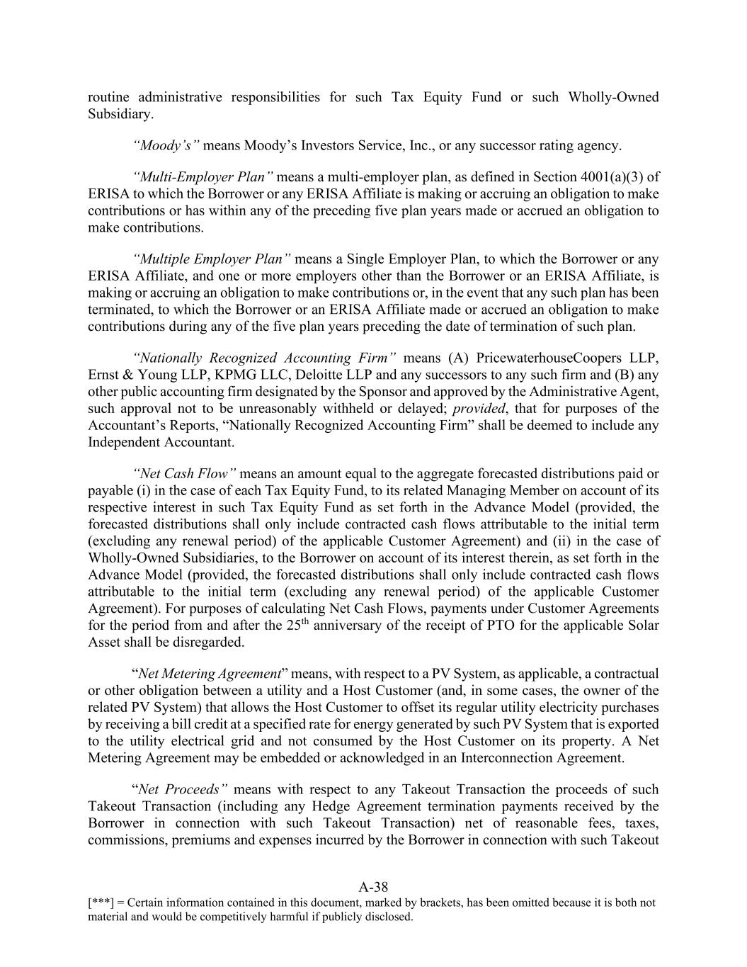 A-38 [***] = Certain information contained in this document, marked by brackets, has been omitted because it is both not material and would be competitively harmful if publicly disclosed. routine administrative responsibilities for such Tax Equity Fund or such Wholly-Owned Subsidiary. “Moody’s” means Moody’s Investors Service, Inc., or any successor rating agency. “Multi-Employer Plan” means a multi-employer plan, as defined in Section 4001(a)(3) of ERISA to which the Borrower or any ERISA Affiliate is making or accruing an obligation to make contributions or has within any of the preceding five plan years made or accrued an obligation to make contributions. “Multiple Employer Plan” means a Single Employer Plan, to which the Borrower or any ERISA Affiliate, and one or more employers other than the Borrower or an ERISA Affiliate, is making or accruing an obligation to make contributions or, in the event that any such plan has been terminated, to which the Borrower or an ERISA Affiliate made or accrued an obligation to make contributions during any of the five plan years preceding the date of termination of such plan. “Nationally Recognized Accounting Firm” means (A) PricewaterhouseCoopers LLP, Ernst & Young LLP, KPMG LLC, Deloitte LLP and any successors to any such firm and (B) any other public accounting firm designated by the Sponsor and approved by the Administrative Agent, such approval not to be unreasonably withheld or delayed; provided, that for purposes of the Accountant’s Reports, “Nationally Recognized Accounting Firm” shall be deemed to include any Independent Accountant. “Net Cash Flow” means an amount equal to the aggregate forecasted distributions paid or payable (i) in the case of each Tax Equity Fund, to its related Managing Member on account of its respective interest in such Tax Equity Fund as set forth in the Advance Model (provided, the forecasted distributions shall only include contracted cash flows attributable to the initial term (excluding any renewal period) of the applicable Customer Agreement) and (ii) in the case of Wholly-Owned Subsidiaries, to the Borrower on account of its interest therein, as set forth in the Advance Model (provided, the forecasted distributions shall only include contracted cash flows attributable to the initial term (excluding any renewal period) of the applicable Customer Agreement). For purposes of calculating Net Cash Flows, payments under Customer Agreements for the period from and after the 25th anniversary of the receipt of PTO for the applicable Solar Asset shall be disregarded. “Net Metering Agreement” means, with respect to a PV System, as applicable, a contractual or other obligation between a utility and a Host Customer (and, in some cases, the owner of the related PV System) that allows the Host Customer to offset its regular utility electricity purchases by receiving a bill credit at a specified rate for energy generated by such PV System that is exported to the utility electrical grid and not consumed by the Host Customer on its property. A Net Metering Agreement may be embedded or acknowledged in an Interconnection Agreement. “Net Proceeds” means with respect to any Takeout Transaction the proceeds of such Takeout Transaction (including any Hedge Agreement termination payments received by the Borrower in connection with such Takeout Transaction) net of reasonable fees, taxes, commissions, premiums and expenses incurred by the Borrower in connection with such Takeout