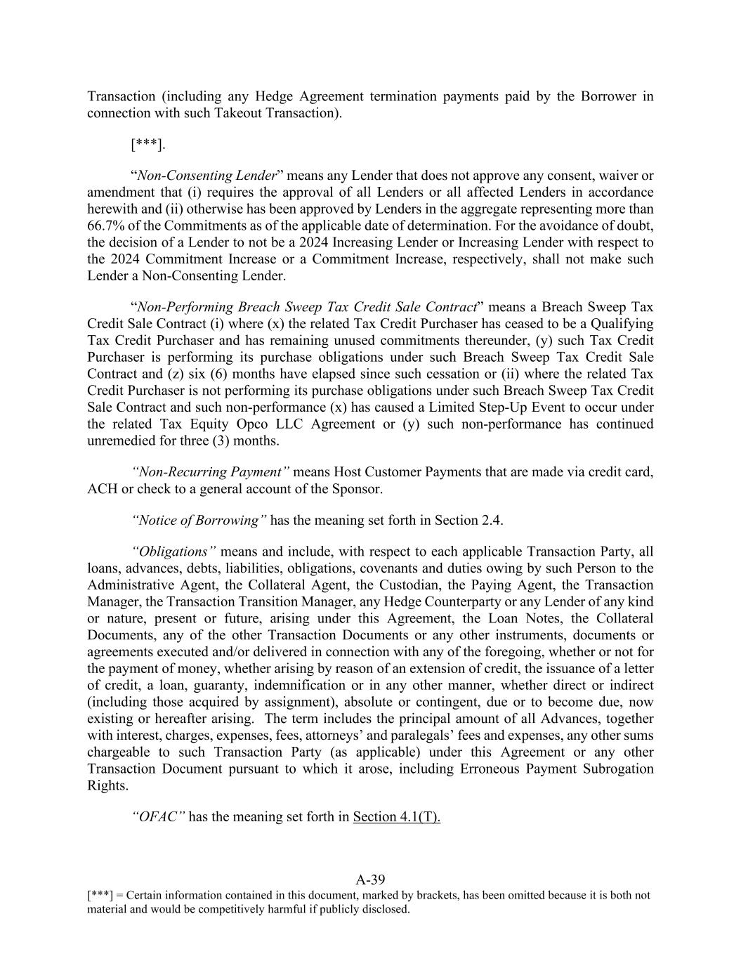 A-39 [***] = Certain information contained in this document, marked by brackets, has been omitted because it is both not material and would be competitively harmful if publicly disclosed. Transaction (including any Hedge Agreement termination payments paid by the Borrower in connection with such Takeout Transaction). [***]. “Non-Consenting Lender” means any Lender that does not approve any consent, waiver or amendment that (i) requires the approval of all Lenders or all affected Lenders in accordance herewith and (ii) otherwise has been approved by Lenders in the aggregate representing more than 66.7% of the Commitments as of the applicable date of determination. For the avoidance of doubt, the decision of a Lender to not be a 2024 Increasing Lender or Increasing Lender with respect to the 2024 Commitment Increase or a Commitment Increase, respectively, shall not make such Lender a Non-Consenting Lender. “Non-Performing Breach Sweep Tax Credit Sale Contract” means a Breach Sweep Tax Credit Sale Contract (i) where (x) the related Tax Credit Purchaser has ceased to be a Qualifying Tax Credit Purchaser and has remaining unused commitments thereunder, (y) such Tax Credit Purchaser is performing its purchase obligations under such Breach Sweep Tax Credit Sale Contract and (z) six (6) months have elapsed since such cessation or (ii) where the related Tax Credit Purchaser is not performing its purchase obligations under such Breach Sweep Tax Credit Sale Contract and such non-performance (x) has caused a Limited Step-Up Event to occur under the related Tax Equity Opco LLC Agreement or (y) such non-performance has continued unremedied for three (3) months. “Non-Recurring Payment” means Host Customer Payments that are made via credit card, ACH or check to a general account of the Sponsor. “Notice of Borrowing” has the meaning set forth in Section 2.4. “Obligations” means and include, with respect to each applicable Transaction Party, all loans, advances, debts, liabilities, obligations, covenants and duties owing by such Person to the Administrative Agent, the Collateral Agent, the Custodian, the Paying Agent, the Transaction Manager, the Transaction Transition Manager, any Hedge Counterparty or any Lender of any kind or nature, present or future, arising under this Agreement, the Loan Notes, the Collateral Documents, any of the other Transaction Documents or any other instruments, documents or agreements executed and/or delivered in connection with any of the foregoing, whether or not for the payment of money, whether arising by reason of an extension of credit, the issuance of a letter of credit, a loan, guaranty, indemnification or in any other manner, whether direct or indirect (including those acquired by assignment), absolute or contingent, due or to become due, now existing or hereafter arising. The term includes the principal amount of all Advances, together with interest, charges, expenses, fees, attorneys’ and paralegals’ fees and expenses, any other sums chargeable to such Transaction Party (as applicable) under this Agreement or any other Transaction Document pursuant to which it arose, including Erroneous Payment Subrogation Rights. “OFAC” has the meaning set forth in Section 4.1(T).