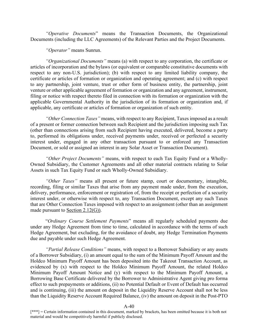 A-40 [***] = Certain information contained in this document, marked by brackets, has been omitted because it is both not material and would be competitively harmful if publicly disclosed. “Operative Documents” means the Transaction Documents, the Organizational Documents (including the LLC Agreements) of the Relevant Parties and the Project Documents. “Operator” means Sunrun. “Organizational Documents” means (a) with respect to any corporation, the certificate or articles of incorporation and the bylaws (or equivalent or comparable constitutive documents with respect to any non-U.S. jurisdiction); (b) with respect to any limited liability company, the certificate or articles of formation or organization and operating agreement; and (c) with respect to any partnership, joint venture, trust or other form of business entity, the partnership, joint venture or other applicable agreement of formation or organization and any agreement, instrument, filing or notice with respect thereto filed in connection with its formation or organization with the applicable Governmental Authority in the jurisdiction of its formation or organization and, if applicable, any certificate or articles of formation or organization of such entity. “Other Connection Taxes” means, with respect to any Recipient, Taxes imposed as a result of a present or former connection between such Recipient and the jurisdiction imposing such Tax (other than connections arising from such Recipient having executed, delivered, become a party to, performed its obligations under, received payments under, received or perfected a security interest under, engaged in any other transaction pursuant to or enforced any Transaction Document, or sold or assigned an interest in any Solar Asset or Transaction Document). “Other Project Documents” means, with respect to each Tax Equity Fund or a Wholly- Owned Subsidiary, the Customer Agreements and all other material contracts relating to Solar Assets in such Tax Equity Fund or such Wholly-Owned Subsidiary. “Other Taxes” means all present or future stamp, court or documentary, intangible, recording, filing or similar Taxes that arise from any payment made under, from the execution, delivery, performance, enforcement or registration of, from the receipt or perfection of a security interest under, or otherwise with respect to, any Transaction Document, except any such Taxes that are Other Connection Taxes imposed with respect to an assignment (other than an assignment made pursuant to Section 2.12(G)). “Ordinary Course Settlement Payments” means all regularly scheduled payments due under any Hedge Agreement from time to time, calculated in accordance with the terms of such Hedge Agreement, but excluding, for the avoidance of doubt, any Hedge Termination Payments due and payable under such Hedge Agreement. “Partial Release Conditions” means, with respect to a Borrower Subsidiary or any assets of a Borrower Subsidiary, (i) an amount equal to the sum of the Minimum Payoff Amount and the Holdco Minimum Payoff Amount has been deposited into the Takeout Transaction Account, as evidenced by (x) with respect to the Holdco Minimum Payoff Amount, the related Holdco Minimum Payoff Amount Notice and (y) with respect to the Minimum Payoff Amount, a Borrowing Base Certificate delivered by the Borrower to Administrative Agent giving pro forma effect to such prepayments or additions, (ii) no Potential Default or Event of Default has occurred and is continuing, (iii) the amount on deposit in the Liquidity Reserve Account shall not be less than the Liquidity Reserve Account Required Balance, (iv) the amount on deposit in the Post-PTO