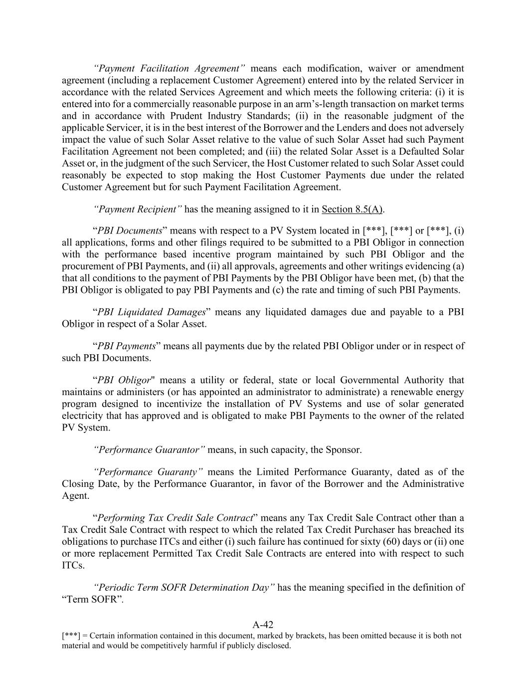 A-42 [***] = Certain information contained in this document, marked by brackets, has been omitted because it is both not material and would be competitively harmful if publicly disclosed. “Payment Facilitation Agreement” means each modification, waiver or amendment agreement (including a replacement Customer Agreement) entered into by the related Servicer in accordance with the related Services Agreement and which meets the following criteria: (i) it is entered into for a commercially reasonable purpose in an arm’s-length transaction on market terms and in accordance with Prudent Industry Standards; (ii) in the reasonable judgment of the applicable Servicer, it is in the best interest of the Borrower and the Lenders and does not adversely impact the value of such Solar Asset relative to the value of such Solar Asset had such Payment Facilitation Agreement not been completed; and (iii) the related Solar Asset is a Defaulted Solar Asset or, in the judgment of the such Servicer, the Host Customer related to such Solar Asset could reasonably be expected to stop making the Host Customer Payments due under the related Customer Agreement but for such Payment Facilitation Agreement. “Payment Recipient” has the meaning assigned to it in Section 8.5(A). “PBI Documents” means with respect to a PV System located in [***], [***] or [***], (i) all applications, forms and other filings required to be submitted to a PBI Obligor in connection with the performance based incentive program maintained by such PBI Obligor and the procurement of PBI Payments, and (ii) all approvals, agreements and other writings evidencing (a) that all conditions to the payment of PBI Payments by the PBI Obligor have been met, (b) that the PBI Obligor is obligated to pay PBI Payments and (c) the rate and timing of such PBI Payments. “PBI Liquidated Damages” means any liquidated damages due and payable to a PBI Obligor in respect of a Solar Asset. “PBI Payments” means all payments due by the related PBI Obligor under or in respect of such PBI Documents. “PBI Obligor" means a utility or federal, state or local Governmental Authority that maintains or administers (or has appointed an administrator to administrate) a renewable energy program designed to incentivize the installation of PV Systems and use of solar generated electricity that has approved and is obligated to make PBI Payments to the owner of the related PV System. “Performance Guarantor” means, in such capacity, the Sponsor. “Performance Guaranty” means the Limited Performance Guaranty, dated as of the Closing Date, by the Performance Guarantor, in favor of the Borrower and the Administrative Agent. “Performing Tax Credit Sale Contract” means any Tax Credit Sale Contract other than a Tax Credit Sale Contract with respect to which the related Tax Credit Purchaser has breached its obligations to purchase ITCs and either (i) such failure has continued for sixty (60) days or (ii) one or more replacement Permitted Tax Credit Sale Contracts are entered into with respect to such ITCs. “Periodic Term SOFR Determination Day” has the meaning specified in the definition of “Term SOFR”.