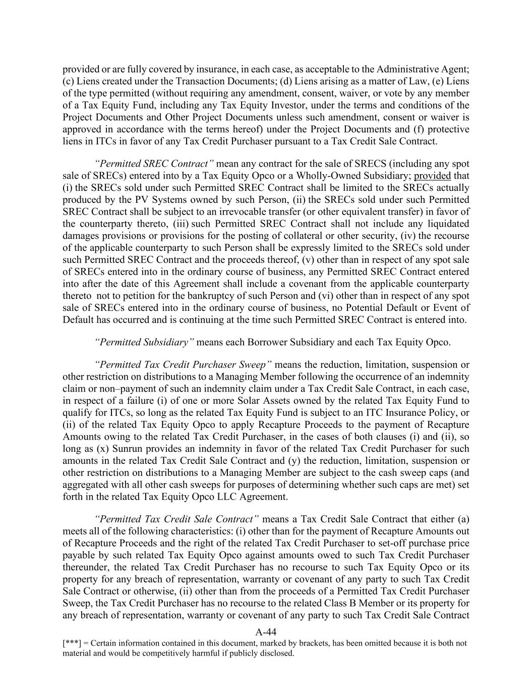 A-44 [***] = Certain information contained in this document, marked by brackets, has been omitted because it is both not material and would be competitively harmful if publicly disclosed. provided or are fully covered by insurance, in each case, as acceptable to the Administrative Agent; (c) Liens created under the Transaction Documents; (d) Liens arising as a matter of Law, (e) Liens of the type permitted (without requiring any amendment, consent, waiver, or vote by any member of a Tax Equity Fund, including any Tax Equity Investor, under the terms and conditions of the Project Documents and Other Project Documents unless such amendment, consent or waiver is approved in accordance with the terms hereof) under the Project Documents and (f) protective liens in ITCs in favor of any Tax Credit Purchaser pursuant to a Tax Credit Sale Contract. “Permitted SREC Contract” mean any contract for the sale of SRECS (including any spot sale of SRECs) entered into by a Tax Equity Opco or a Wholly-Owned Subsidiary; provided that (i) the SRECs sold under such Permitted SREC Contract shall be limited to the SRECs actually produced by the PV Systems owned by such Person, (ii) the SRECs sold under such Permitted SREC Contract shall be subject to an irrevocable transfer (or other equivalent transfer) in favor of the counterparty thereto, (iii) such Permitted SREC Contract shall not include any liquidated damages provisions or provisions for the posting of collateral or other security, (iv) the recourse of the applicable counterparty to such Person shall be expressly limited to the SRECs sold under such Permitted SREC Contract and the proceeds thereof, (v) other than in respect of any spot sale of SRECs entered into in the ordinary course of business, any Permitted SREC Contract entered into after the date of this Agreement shall include a covenant from the applicable counterparty thereto not to petition for the bankruptcy of such Person and (vi) other than in respect of any spot sale of SRECs entered into in the ordinary course of business, no Potential Default or Event of Default has occurred and is continuing at the time such Permitted SREC Contract is entered into. “Permitted Subsidiary” means each Borrower Subsidiary and each Tax Equity Opco. “Permitted Tax Credit Purchaser Sweep” means the reduction, limitation, suspension or other restriction on distributions to a Managing Member following the occurrence of an indemnity claim or non–payment of such an indemnity claim under a Tax Credit Sale Contract, in each case, in respect of a failure (i) of one or more Solar Assets owned by the related Tax Equity Fund to qualify for ITCs, so long as the related Tax Equity Fund is subject to an ITC Insurance Policy, or (ii) of the related Tax Equity Opco to apply Recapture Proceeds to the payment of Recapture Amounts owing to the related Tax Credit Purchaser, in the cases of both clauses (i) and (ii), so long as (x) Sunrun provides an indemnity in favor of the related Tax Credit Purchaser for such amounts in the related Tax Credit Sale Contract and (y) the reduction, limitation, suspension or other restriction on distributions to a Managing Member are subject to the cash sweep caps (and aggregated with all other cash sweeps for purposes of determining whether such caps are met) set forth in the related Tax Equity Opco LLC Agreement. “Permitted Tax Credit Sale Contract” means a Tax Credit Sale Contract that either (a) meets all of the following characteristics: (i) other than for the payment of Recapture Amounts out of Recapture Proceeds and the right of the related Tax Credit Purchaser to set-off purchase price payable by such related Tax Equity Opco against amounts owed to such Tax Credit Purchaser thereunder, the related Tax Credit Purchaser has no recourse to such Tax Equity Opco or its property for any breach of representation, warranty or covenant of any party to such Tax Credit Sale Contract or otherwise, (ii) other than from the proceeds of a Permitted Tax Credit Purchaser Sweep, the Tax Credit Purchaser has no recourse to the related Class B Member or its property for any breach of representation, warranty or covenant of any party to such Tax Credit Sale Contract