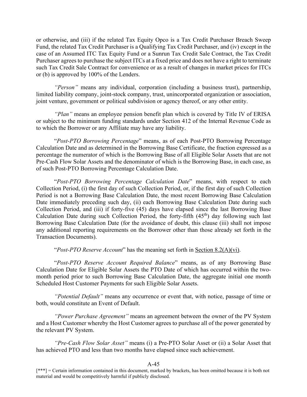 A-45 [***] = Certain information contained in this document, marked by brackets, has been omitted because it is both not material and would be competitively harmful if publicly disclosed. or otherwise, and (iii) if the related Tax Equity Opco is a Tax Credit Purchaser Breach Sweep Fund, the related Tax Credit Purchaser is a Qualifying Tax Credit Purchaser, and (iv) except in the case of an Assumed ITC Tax Equity Fund or a Sunrun Tax Credit Sale Contract, the Tax Credit Purchaser agrees to purchase the subject ITCs at a fixed price and does not have a right to terminate such Tax Credit Sale Contract for convenience or as a result of changes in market prices for ITCs or (b) is approved by 100% of the Lenders. “Person” means any individual, corporation (including a business trust), partnership, limited liability company, joint-stock company, trust, unincorporated organization or association, joint venture, government or political subdivision or agency thereof, or any other entity. “Plan” means an employee pension benefit plan which is covered by Title IV of ERISA or subject to the minimum funding standards under Section 412 of the Internal Revenue Code as to which the Borrower or any Affiliate may have any liability. “Post-PTO Borrowing Percentage” means, as of each Post-PTO Borrowing Percentage Calculation Date and as determined in the Borrowing Base Certificate, the fraction expressed as a percentage the numerator of which is the Borrowing Base of all Eligible Solar Assets that are not Pre-Cash Flow Solar Assets and the denominator of which is the Borrowing Base, in each case, as of such Post-PTO Borrowing Percentage Calculation Date. “Post-PTO Borrowing Percentage Calculation Date” means, with respect to each Collection Period, (i) the first day of such Collection Period, or, if the first day of such Collection Period is not a Borrowing Base Calculation Date, the most recent Borrowing Base Calculation Date immediately preceding such day, (ii) each Borrowing Base Calculation Date during such Collection Period, and (iii) if forty-five (45) days have elapsed since the last Borrowing Base Calculation Date during such Collection Period, the forty-fifth (45th) day following such last Borrowing Base Calculation Date (for the avoidance of doubt, this clause (iii) shall not impose any additional reporting requirements on the Borrower other than those already set forth in the Transaction Documents). “Post-PTO Reserve Account” has the meaning set forth in Section 8.2(A)(vi). “Post-PTO Reserve Account Required Balance” means, as of any Borrowing Base Calculation Date for Eligible Solar Assets the PTO Date of which has occurred within the two- month period prior to such Borrowing Base Calculation Date, the aggregate initial one month Scheduled Host Customer Payments for such Eligible Solar Assets. “Potential Default” means any occurrence or event that, with notice, passage of time or both, would constitute an Event of Default. “Power Purchase Agreement” means an agreement between the owner of the PV System and a Host Customer whereby the Host Customer agrees to purchase all of the power generated by the relevant PV System. “Pre-Cash Flow Solar Asset” means (i) a Pre-PTO Solar Asset or (ii) a Solar Asset that has achieved PTO and less than two months have elapsed since such achievement.