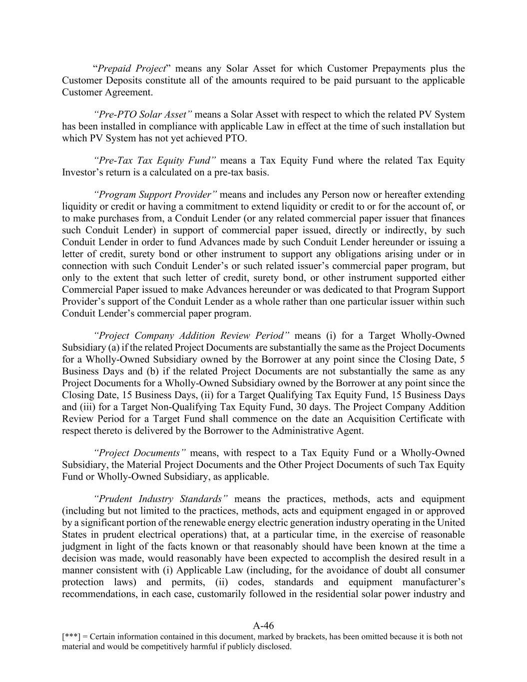 A-46 [***] = Certain information contained in this document, marked by brackets, has been omitted because it is both not material and would be competitively harmful if publicly disclosed. “Prepaid Project” means any Solar Asset for which Customer Prepayments plus the Customer Deposits constitute all of the amounts required to be paid pursuant to the applicable Customer Agreement. “Pre-PTO Solar Asset” means a Solar Asset with respect to which the related PV System has been installed in compliance with applicable Law in effect at the time of such installation but which PV System has not yet achieved PTO. “Pre-Tax Tax Equity Fund” means a Tax Equity Fund where the related Tax Equity Investor’s return is a calculated on a pre-tax basis. “Program Support Provider” means and includes any Person now or hereafter extending liquidity or credit or having a commitment to extend liquidity or credit to or for the account of, or to make purchases from, a Conduit Lender (or any related commercial paper issuer that finances such Conduit Lender) in support of commercial paper issued, directly or indirectly, by such Conduit Lender in order to fund Advances made by such Conduit Lender hereunder or issuing a letter of credit, surety bond or other instrument to support any obligations arising under or in connection with such Conduit Lender’s or such related issuer’s commercial paper program, but only to the extent that such letter of credit, surety bond, or other instrument supported either Commercial Paper issued to make Advances hereunder or was dedicated to that Program Support Provider’s support of the Conduit Lender as a whole rather than one particular issuer within such Conduit Lender’s commercial paper program. “Project Company Addition Review Period” means (i) for a Target Wholly-Owned Subsidiary (a) if the related Project Documents are substantially the same as the Project Documents for a Wholly-Owned Subsidiary owned by the Borrower at any point since the Closing Date, 5 Business Days and (b) if the related Project Documents are not substantially the same as any Project Documents for a Wholly-Owned Subsidiary owned by the Borrower at any point since the Closing Date, 15 Business Days, (ii) for a Target Qualifying Tax Equity Fund, 15 Business Days and (iii) for a Target Non-Qualifying Tax Equity Fund, 30 days. The Project Company Addition Review Period for a Target Fund shall commence on the date an Acquisition Certificate with respect thereto is delivered by the Borrower to the Administrative Agent. “Project Documents” means, with respect to a Tax Equity Fund or a Wholly-Owned Subsidiary, the Material Project Documents and the Other Project Documents of such Tax Equity Fund or Wholly-Owned Subsidiary, as applicable. “Prudent Industry Standards” means the practices, methods, acts and equipment (including but not limited to the practices, methods, acts and equipment engaged in or approved by a significant portion of the renewable energy electric generation industry operating in the United States in prudent electrical operations) that, at a particular time, in the exercise of reasonable judgment in light of the facts known or that reasonably should have been known at the time a decision was made, would reasonably have been expected to accomplish the desired result in a manner consistent with (i) Applicable Law (including, for the avoidance of doubt all consumer protection laws) and permits, (ii) codes, standards and equipment manufacturer’s recommendations, in each case, customarily followed in the residential solar power industry and