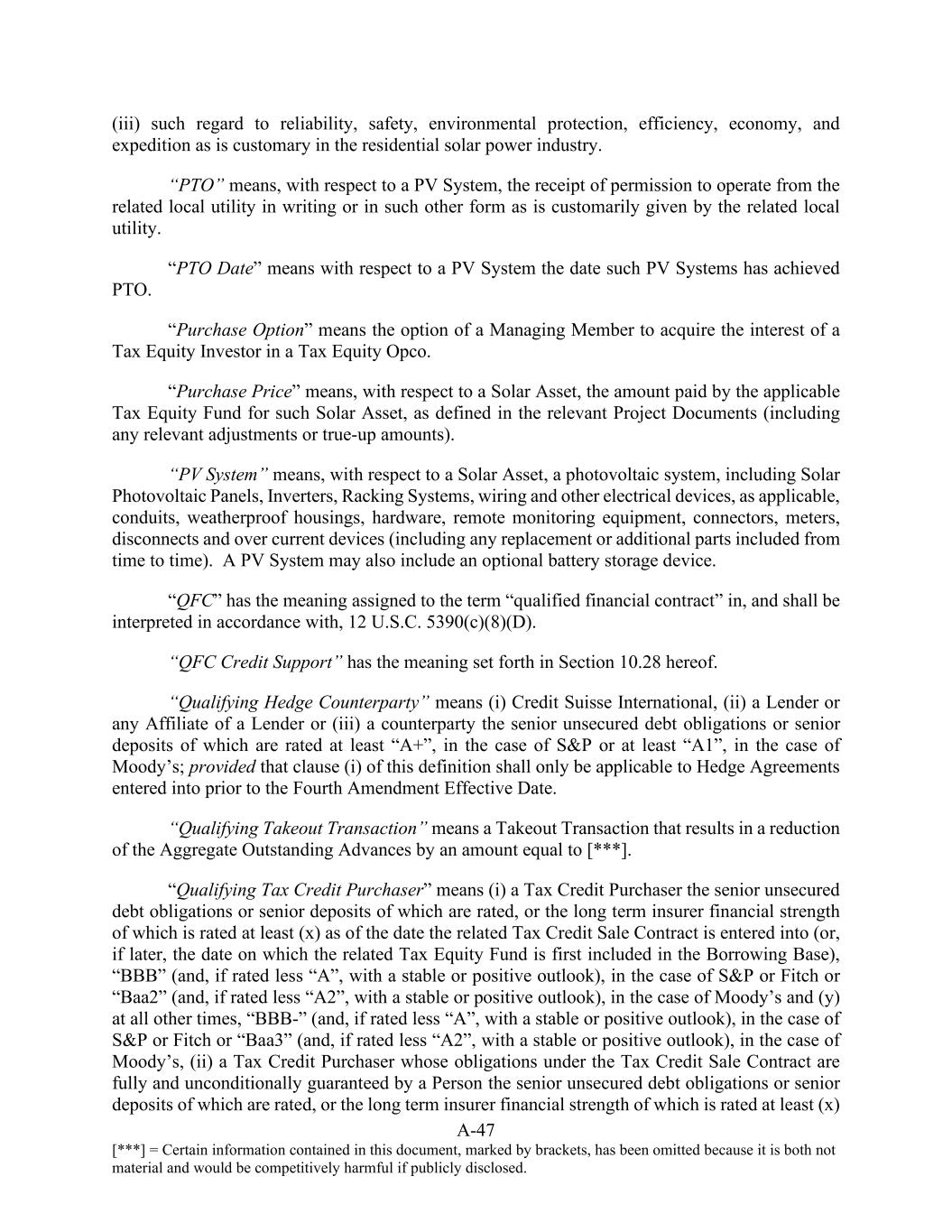 A-47 [***] = Certain information contained in this document, marked by brackets, has been omitted because it is both not material and would be competitively harmful if publicly disclosed. (iii) such regard to reliability, safety, environmental protection, efficiency, economy, and expedition as is customary in the residential solar power industry. “PTO” means, with respect to a PV System, the receipt of permission to operate from the related local utility in writing or in such other form as is customarily given by the related local utility. “PTO Date” means with respect to a PV System the date such PV Systems has achieved PTO. “Purchase Option” means the option of a Managing Member to acquire the interest of a Tax Equity Investor in a Tax Equity Opco. “Purchase Price” means, with respect to a Solar Asset, the amount paid by the applicable Tax Equity Fund for such Solar Asset, as defined in the relevant Project Documents (including any relevant adjustments or true-up amounts). “PV System” means, with respect to a Solar Asset, a photovoltaic system, including Solar Photovoltaic Panels, Inverters, Racking Systems, wiring and other electrical devices, as applicable, conduits, weatherproof housings, hardware, remote monitoring equipment, connectors, meters, disconnects and over current devices (including any replacement or additional parts included from time to time). A PV System may also include an optional battery storage device. “QFC” has the meaning assigned to the term “qualified financial contract” in, and shall be interpreted in accordance with, 12 U.S.C. 5390(c)(8)(D). “QFC Credit Support” has the meaning set forth in Section 10.28 hereof. “Qualifying Hedge Counterparty” means (i) Credit Suisse International, (ii) a Lender or any Affiliate of a Lender or (iii) a counterparty the senior unsecured debt obligations or senior deposits of which are rated at least “A+”, in the case of S&P or at least “A1”, in the case of Moody’s; provided that clause (i) of this definition shall only be applicable to Hedge Agreements entered into prior to the Fourth Amendment Effective Date. “Qualifying Takeout Transaction” means a Takeout Transaction that results in a reduction of the Aggregate Outstanding Advances by an amount equal to [***]. “Qualifying Tax Credit Purchaser” means (i) a Tax Credit Purchaser the senior unsecured debt obligations or senior deposits of which are rated, or the long term insurer financial strength of which is rated at least (x) as of the date the related Tax Credit Sale Contract is entered into (or, if later, the date on which the related Tax Equity Fund is first included in the Borrowing Base), “BBB” (and, if rated less “A”, with a stable or positive outlook), in the case of S&P or Fitch or “Baa2” (and, if rated less “A2”, with a stable or positive outlook), in the case of Moody’s and (y) at all other times, “BBB-” (and, if rated less “A”, with a stable or positive outlook), in the case of S&P or Fitch or “Baa3” (and, if rated less “A2”, with a stable or positive outlook), in the case of Moody’s, (ii) a Tax Credit Purchaser whose obligations under the Tax Credit Sale Contract are fully and unconditionally guaranteed by a Person the senior unsecured debt obligations or senior deposits of which are rated, or the long term insurer financial strength of which is rated at least (x)