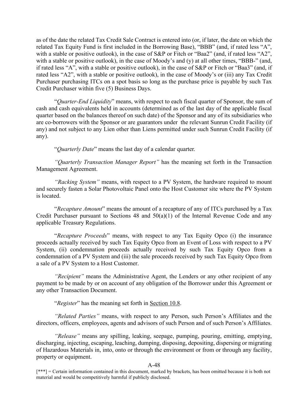 A-48 [***] = Certain information contained in this document, marked by brackets, has been omitted because it is both not material and would be competitively harmful if publicly disclosed. as of the date the related Tax Credit Sale Contract is entered into (or, if later, the date on which the related Tax Equity Fund is first included in the Borrowing Base), “BBB” (and, if rated less “A”, with a stable or positive outlook), in the case of S&P or Fitch or “Baa2” (and, if rated less “A2”, with a stable or positive outlook), in the case of Moody’s and (y) at all other times, “BBB-” (and, if rated less “A”, with a stable or positive outlook), in the case of S&P or Fitch or “Baa3” (and, if rated less “A2”, with a stable or positive outlook), in the case of Moody’s or (iii) any Tax Credit Purchaser purchasing ITCs on a spot basis so long as the purchase price is payable by such Tax Credit Purchaser within five (5) Business Days. “Quarter-End Liquidity” means, with respect to each fiscal quarter of Sponsor, the sum of cash and cash equivalents held in accounts (determined as of the last day of the applicable fiscal quarter based on the balances thereof on such date) of the Sponsor and any of its subsidiaries who are co-borrowers with the Sponsor or are guarantors under the relevant Sunrun Credit Facility (if any) and not subject to any Lien other than Liens permitted under such Sunrun Credit Facility (if any). “Quarterly Date” means the last day of a calendar quarter. “Quarterly Transaction Manager Report” has the meaning set forth in the Transaction Management Agreement. “Racking System” means, with respect to a PV System, the hardware required to mount and securely fasten a Solar Photovoltaic Panel onto the Host Customer site where the PV System is located. “Recapture Amount” means the amount of a recapture of any of ITCs purchased by a Tax Credit Purchaser pursuant to Sections 48 and 50(a)(1) of the Internal Revenue Code and any applicable Treasury Regulations. “Recapture Proceeds” means, with respect to any Tax Equity Opco (i) the insurance proceeds actually received by such Tax Equity Opco from an Event of Loss with respect to a PV System, (ii) condemnation proceeds actually received by such Tax Equity Opco from a condemnation of a PV System and (iii) the sale proceeds received by such Tax Equity Opco from a sale of a PV System to a Host Customer. “Recipient” means the Administrative Agent, the Lenders or any other recipient of any payment to be made by or on account of any obligation of the Borrower under this Agreement or any other Transaction Document. “Register” has the meaning set forth in Section 10.8. “Related Parties” means, with respect to any Person, such Person’s Affiliates and the directors, officers, employees, agents and advisors of such Person and of such Person’s Affiliates. “Release” means any spilling, leaking, seepage, pumping, pouring, emitting, emptying, discharging, injecting, escaping, leaching, dumping, disposing, depositing, dispersing or migrating of Hazardous Materials in, into, onto or through the environment or from or through any facility, property or equipment.
