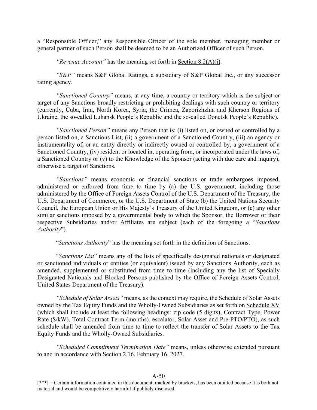 A-50 [***] = Certain information contained in this document, marked by brackets, has been omitted because it is both not material and would be competitively harmful if publicly disclosed. a “Responsible Officer,” any Responsible Officer of the sole member, managing member or general partner of such Person shall be deemed to be an Authorized Officer of such Person. “Revenue Account” has the meaning set forth in Section 8.2(A)(i). “S&P” means S&P Global Ratings, a subsidiary of S&P Global Inc., or any successor rating agency. “Sanctioned Country” means, at any time, a country or territory which is the subject or target of any Sanctions broadly restricting or prohibiting dealings with such country or territory (currently, Cuba, Iran, North Korea, Syria, the Crimea, Zaporizhzhia and Kherson Regions of Ukraine, the so-called Luhansk People’s Republic and the so-called Donetsk People’s Republic). “Sanctioned Person” means any Person that is: (i) listed on, or owned or controlled by a person listed on, a Sanctions List, (ii) a government of a Sanctioned Country, (iii) an agency or instrumentality of, or an entity directly or indirectly owned or controlled by, a government of a Sanctioned Country, (iv) resident or located in, operating from, or incorporated under the laws of, a Sanctioned Country or (v) to the Knowledge of the Sponsor (acting with due care and inquiry), otherwise a target of Sanctions. “Sanctions” means economic or financial sanctions or trade embargoes imposed, administered or enforced from time to time by (a) the U.S. government, including those administered by the Office of Foreign Assets Control of the U.S. Department of the Treasury, the U.S. Department of Commerce, or the U.S. Department of State (b) the United Nations Security Council, the European Union or His Majesty’s Treasury of the United Kingdom, or (c) any other similar sanctions imposed by a governmental body to which the Sponsor, the Borrower or their respective Subsidiaries and/or Affiliates are subject (each of the foregoing a “Sanctions Authority”). “Sanctions Authority” has the meaning set forth in the definition of Sanctions. “Sanctions List” means any of the lists of specifically designated nationals or designated or sanctioned individuals or entities (or equivalent) issued by any Sanctions Authority, each as amended, supplemented or substituted from time to time (including any the list of Specially Designated Nationals and Blocked Persons published by the Office of Foreign Assets Control, United States Department of the Treasury). “Schedule of Solar Assets” means, as the context may require, the Schedule of Solar Assets owned by the Tax Equity Funds and the Wholly-Owned Subsidiaries as set forth on Schedule XV (which shall include at least the following headings: zip code (5 digits), Contract Type, Power Rate ($/kW), Total Contract Term (months), escalator, Solar Asset and Pre-PTO/PTO), as such schedule shall be amended from time to time to reflect the transfer of Solar Assets to the Tax Equity Funds and the Wholly-Owned Subsidiaries. “Scheduled Commitment Termination Date” means, unless otherwise extended pursuant to and in accordance with Section 2.16, February 16, 2027.