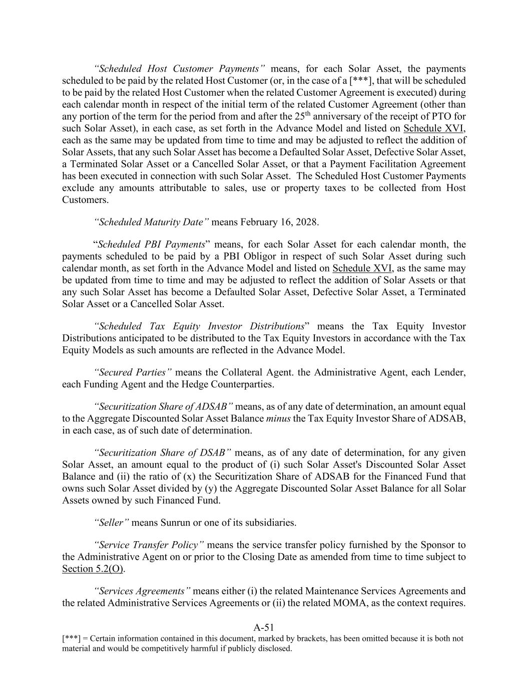 A-51 [***] = Certain information contained in this document, marked by brackets, has been omitted because it is both not material and would be competitively harmful if publicly disclosed. “Scheduled Host Customer Payments” means, for each Solar Asset, the payments scheduled to be paid by the related Host Customer (or, in the case of a [***], that will be scheduled to be paid by the related Host Customer when the related Customer Agreement is executed) during each calendar month in respect of the initial term of the related Customer Agreement (other than any portion of the term for the period from and after the 25th anniversary of the receipt of PTO for such Solar Asset), in each case, as set forth in the Advance Model and listed on Schedule XVI, each as the same may be updated from time to time and may be adjusted to reflect the addition of Solar Assets, that any such Solar Asset has become a Defaulted Solar Asset, Defective Solar Asset, a Terminated Solar Asset or a Cancelled Solar Asset, or that a Payment Facilitation Agreement has been executed in connection with such Solar Asset. The Scheduled Host Customer Payments exclude any amounts attributable to sales, use or property taxes to be collected from Host Customers. “Scheduled Maturity Date” means February 16, 2028. “Scheduled PBI Payments” means, for each Solar Asset for each calendar month, the payments scheduled to be paid by a PBI Obligor in respect of such Solar Asset during such calendar month, as set forth in the Advance Model and listed on Schedule XVI, as the same may be updated from time to time and may be adjusted to reflect the addition of Solar Assets or that any such Solar Asset has become a Defaulted Solar Asset, Defective Solar Asset, a Terminated Solar Asset or a Cancelled Solar Asset. “Scheduled Tax Equity Investor Distributions” means the Tax Equity Investor Distributions anticipated to be distributed to the Tax Equity Investors in accordance with the Tax Equity Models as such amounts are reflected in the Advance Model. “Secured Parties” means the Collateral Agent. the Administrative Agent, each Lender, each Funding Agent and the Hedge Counterparties. “Securitization Share of ADSAB” means, as of any date of determination, an amount equal to the Aggregate Discounted Solar Asset Balance minus the Tax Equity Investor Share of ADSAB, in each case, as of such date of determination. “Securitization Share of DSAB” means, as of any date of determination, for any given Solar Asset, an amount equal to the product of (i) such Solar Asset's Discounted Solar Asset Balance and (ii) the ratio of (x) the Securitization Share of ADSAB for the Financed Fund that owns such Solar Asset divided by (y) the Aggregate Discounted Solar Asset Balance for all Solar Assets owned by such Financed Fund. “Seller” means Sunrun or one of its subsidiaries. “Service Transfer Policy” means the service transfer policy furnished by the Sponsor to the Administrative Agent on or prior to the Closing Date as amended from time to time subject to Section 5.2(O). “Services Agreements” means either (i) the related Maintenance Services Agreements and the related Administrative Services Agreements or (ii) the related MOMA, as the context requires.