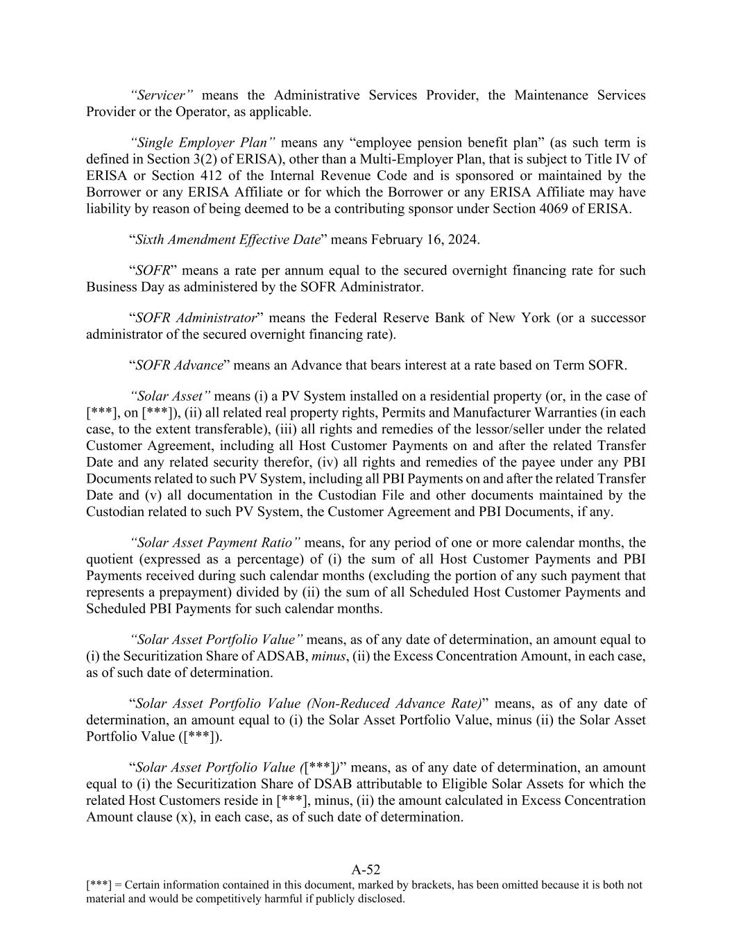 A-52 [***] = Certain information contained in this document, marked by brackets, has been omitted because it is both not material and would be competitively harmful if publicly disclosed. “Servicer” means the Administrative Services Provider, the Maintenance Services Provider or the Operator, as applicable. “Single Employer Plan” means any “employee pension benefit plan” (as such term is defined in Section 3(2) of ERISA), other than a Multi-Employer Plan, that is subject to Title IV of ERISA or Section 412 of the Internal Revenue Code and is sponsored or maintained by the Borrower or any ERISA Affiliate or for which the Borrower or any ERISA Affiliate may have liability by reason of being deemed to be a contributing sponsor under Section 4069 of ERISA. “Sixth Amendment Effective Date” means February 16, 2024. “SOFR” means a rate per annum equal to the secured overnight financing rate for such Business Day as administered by the SOFR Administrator. “SOFR Administrator” means the Federal Reserve Bank of New York (or a successor administrator of the secured overnight financing rate). “SOFR Advance” means an Advance that bears interest at a rate based on Term SOFR. “Solar Asset” means (i) a PV System installed on a residential property (or, in the case of [***], on [***]), (ii) all related real property rights, Permits and Manufacturer Warranties (in each case, to the extent transferable), (iii) all rights and remedies of the lessor/seller under the related Customer Agreement, including all Host Customer Payments on and after the related Transfer Date and any related security therefor, (iv) all rights and remedies of the payee under any PBI Documents related to such PV System, including all PBI Payments on and after the related Transfer Date and (v) all documentation in the Custodian File and other documents maintained by the Custodian related to such PV System, the Customer Agreement and PBI Documents, if any. “Solar Asset Payment Ratio” means, for any period of one or more calendar months, the quotient (expressed as a percentage) of (i) the sum of all Host Customer Payments and PBI Payments received during such calendar months (excluding the portion of any such payment that represents a prepayment) divided by (ii) the sum of all Scheduled Host Customer Payments and Scheduled PBI Payments for such calendar months. “Solar Asset Portfolio Value” means, as of any date of determination, an amount equal to (i) the Securitization Share of ADSAB, minus, (ii) the Excess Concentration Amount, in each case, as of such date of determination. “Solar Asset Portfolio Value (Non-Reduced Advance Rate)” means, as of any date of determination, an amount equal to (i) the Solar Asset Portfolio Value, minus (ii) the Solar Asset Portfolio Value ([***]). “Solar Asset Portfolio Value ([***])” means, as of any date of determination, an amount equal to (i) the Securitization Share of DSAB attributable to Eligible Solar Assets for which the related Host Customers reside in [***], minus, (ii) the amount calculated in Excess Concentration Amount clause (x), in each case, as of such date of determination.