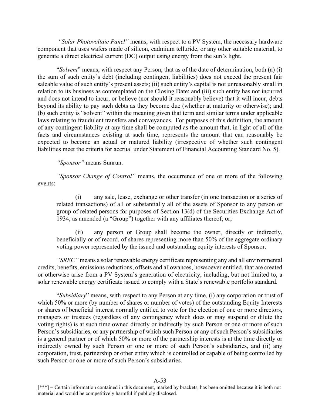 A-53 [***] = Certain information contained in this document, marked by brackets, has been omitted because it is both not material and would be competitively harmful if publicly disclosed. “Solar Photovoltaic Panel” means, with respect to a PV System, the necessary hardware component that uses wafers made of silicon, cadmium telluride, or any other suitable material, to generate a direct electrical current (DC) output using energy from the sun’s light. “Solvent” means, with respect any Person, that as of the date of determination, both (a) (i) the sum of such entity’s debt (including contingent liabilities) does not exceed the present fair saleable value of such entity’s present assets; (ii) such entity’s capital is not unreasonably small in relation to its business as contemplated on the Closing Date; and (iii) such entity has not incurred and does not intend to incur, or believe (nor should it reasonably believe) that it will incur, debts beyond its ability to pay such debts as they become due (whether at maturity or otherwise); and (b) such entity is “solvent” within the meaning given that term and similar terms under applicable laws relating to fraudulent transfers and conveyances. For purposes of this definition, the amount of any contingent liability at any time shall be computed as the amount that, in light of all of the facts and circumstances existing at such time, represents the amount that can reasonably be expected to become an actual or matured liability (irrespective of whether such contingent liabilities meet the criteria for accrual under Statement of Financial Accounting Standard No. 5). “Sponsor” means Sunrun. “Sponsor Change of Control” means, the occurrence of one or more of the following events: (i) any sale, lease, exchange or other transfer (in one transaction or a series of related transactions) of all or substantially all of the assets of Sponsor to any person or group of related persons for purposes of Section 13(d) of the Securities Exchange Act of 1934, as amended (a “Group”) together with any affiliates thereof; or; (ii) any person or Group shall become the owner, directly or indirectly, beneficially or of record, of shares representing more than 50% of the aggregate ordinary voting power represented by the issued and outstanding equity interests of Sponsor. “SREC” means a solar renewable energy certificate representing any and all environmental credits, benefits, emissions reductions, offsets and allowances, howsoever entitled, that are created or otherwise arise from a PV System’s generation of electricity, including, but not limited to, a solar renewable energy certificate issued to comply with a State’s renewable portfolio standard. “Subsidiary” means, with respect to any Person at any time, (i) any corporation or trust of which 50% or more (by number of shares or number of votes) of the outstanding Equity Interests or shares of beneficial interest normally entitled to vote for the election of one or more directors, managers or trustees (regardless of any contingency which does or may suspend or dilute the voting rights) is at such time owned directly or indirectly by such Person or one or more of such Person’s subsidiaries, or any partnership of which such Person or any of such Person’s subsidiaries is a general partner or of which 50% or more of the partnership interests is at the time directly or indirectly owned by such Person or one or more of such Person’s subsidiaries, and (ii) any corporation, trust, partnership or other entity which is controlled or capable of being controlled by such Person or one or more of such Person’s subsidiaries.