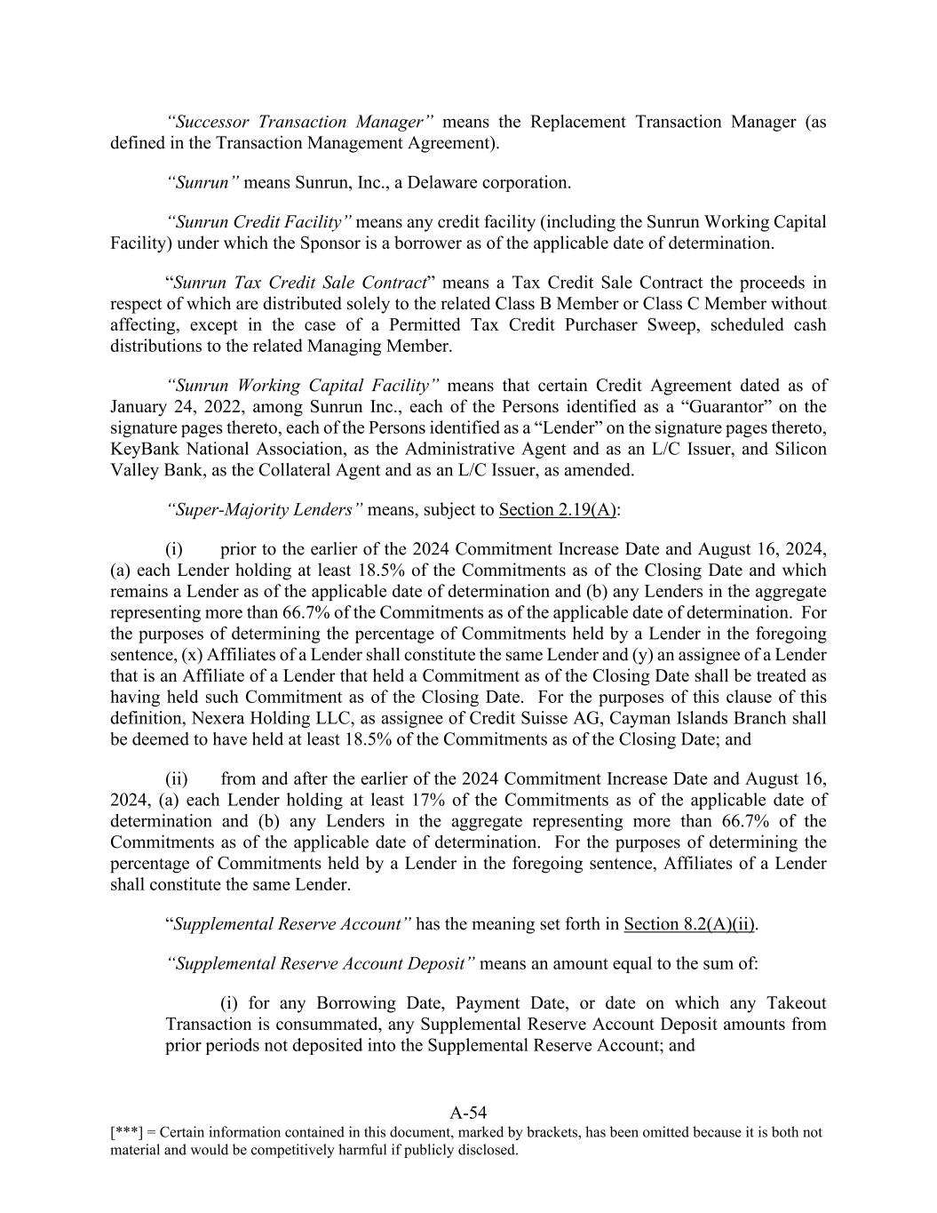 A-54 [***] = Certain information contained in this document, marked by brackets, has been omitted because it is both not material and would be competitively harmful if publicly disclosed. “Successor Transaction Manager” means the Replacement Transaction Manager (as defined in the Transaction Management Agreement). “Sunrun” means Sunrun, Inc., a Delaware corporation. “Sunrun Credit Facility” means any credit facility (including the Sunrun Working Capital Facility) under which the Sponsor is a borrower as of the applicable date of determination. “Sunrun Tax Credit Sale Contract” means a Tax Credit Sale Contract the proceeds in respect of which are distributed solely to the related Class B Member or Class C Member without affecting, except in the case of a Permitted Tax Credit Purchaser Sweep, scheduled cash distributions to the related Managing Member. “Sunrun Working Capital Facility” means that certain Credit Agreement dated as of January 24, 2022, among Sunrun Inc., each of the Persons identified as a “Guarantor” on the signature pages thereto, each of the Persons identified as a “Lender” on the signature pages thereto, KeyBank National Association, as the Administrative Agent and as an L/C Issuer, and Silicon Valley Bank, as the Collateral Agent and as an L/C Issuer, as amended. “Super-Majority Lenders” means, subject to Section 2.19(A): (i) prior to the earlier of the 2024 Commitment Increase Date and August 16, 2024, (a) each Lender holding at least 18.5% of the Commitments as of the Closing Date and which remains a Lender as of the applicable date of determination and (b) any Lenders in the aggregate representing more than 66.7% of the Commitments as of the applicable date of determination. For the purposes of determining the percentage of Commitments held by a Lender in the foregoing sentence, (x) Affiliates of a Lender shall constitute the same Lender and (y) an assignee of a Lender that is an Affiliate of a Lender that held a Commitment as of the Closing Date shall be treated as having held such Commitment as of the Closing Date. For the purposes of this clause of this definition, Nexera Holding LLC, as assignee of Credit Suisse AG, Cayman Islands Branch shall be deemed to have held at least 18.5% of the Commitments as of the Closing Date; and (ii) from and after the earlier of the 2024 Commitment Increase Date and August 16, 2024, (a) each Lender holding at least 17% of the Commitments as of the applicable date of determination and (b) any Lenders in the aggregate representing more than 66.7% of the Commitments as of the applicable date of determination. For the purposes of determining the percentage of Commitments held by a Lender in the foregoing sentence, Affiliates of a Lender shall constitute the same Lender. “Supplemental Reserve Account” has the meaning set forth in Section 8.2(A)(ii). “Supplemental Reserve Account Deposit” means an amount equal to the sum of: (i) for any Borrowing Date, Payment Date, or date on which any Takeout Transaction is consummated, any Supplemental Reserve Account Deposit amounts from prior periods not deposited into the Supplemental Reserve Account; and
