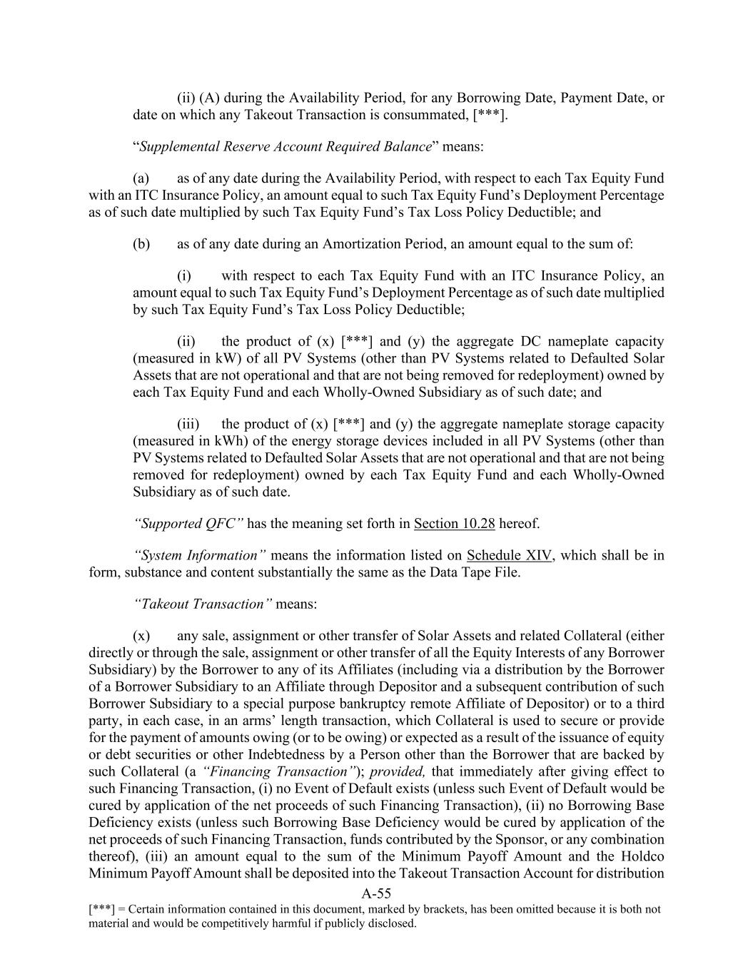 A-55 [***] = Certain information contained in this document, marked by brackets, has been omitted because it is both not material and would be competitively harmful if publicly disclosed. (ii) (A) during the Availability Period, for any Borrowing Date, Payment Date, or date on which any Takeout Transaction is consummated, [***]. “Supplemental Reserve Account Required Balance” means: (a) as of any date during the Availability Period, with respect to each Tax Equity Fund with an ITC Insurance Policy, an amount equal to such Tax Equity Fund’s Deployment Percentage as of such date multiplied by such Tax Equity Fund’s Tax Loss Policy Deductible; and (b) as of any date during an Amortization Period, an amount equal to the sum of: (i) with respect to each Tax Equity Fund with an ITC Insurance Policy, an amount equal to such Tax Equity Fund’s Deployment Percentage as of such date multiplied by such Tax Equity Fund’s Tax Loss Policy Deductible; (ii) the product of (x) [***] and (y) the aggregate DC nameplate capacity (measured in kW) of all PV Systems (other than PV Systems related to Defaulted Solar Assets that are not operational and that are not being removed for redeployment) owned by each Tax Equity Fund and each Wholly-Owned Subsidiary as of such date; and (iii) the product of (x) [***] and (y) the aggregate nameplate storage capacity (measured in kWh) of the energy storage devices included in all PV Systems (other than PV Systems related to Defaulted Solar Assets that are not operational and that are not being removed for redeployment) owned by each Tax Equity Fund and each Wholly-Owned Subsidiary as of such date. “Supported QFC” has the meaning set forth in Section 10.28 hereof. “System Information” means the information listed on Schedule XIV, which shall be in form, substance and content substantially the same as the Data Tape File. “Takeout Transaction” means: (x) any sale, assignment or other transfer of Solar Assets and related Collateral (either directly or through the sale, assignment or other transfer of all the Equity Interests of any Borrower Subsidiary) by the Borrower to any of its Affiliates (including via a distribution by the Borrower of a Borrower Subsidiary to an Affiliate through Depositor and a subsequent contribution of such Borrower Subsidiary to a special purpose bankruptcy remote Affiliate of Depositor) or to a third party, in each case, in an arms’ length transaction, which Collateral is used to secure or provide for the payment of amounts owing (or to be owing) or expected as a result of the issuance of equity or debt securities or other Indebtedness by a Person other than the Borrower that are backed by such Collateral (a “Financing Transaction”); provided, that immediately after giving effect to such Financing Transaction, (i) no Event of Default exists (unless such Event of Default would be cured by application of the net proceeds of such Financing Transaction), (ii) no Borrowing Base Deficiency exists (unless such Borrowing Base Deficiency would be cured by application of the net proceeds of such Financing Transaction, funds contributed by the Sponsor, or any combination thereof), (iii) an amount equal to the sum of the Minimum Payoff Amount and the Holdco Minimum Payoff Amount shall be deposited into the Takeout Transaction Account for distribution
