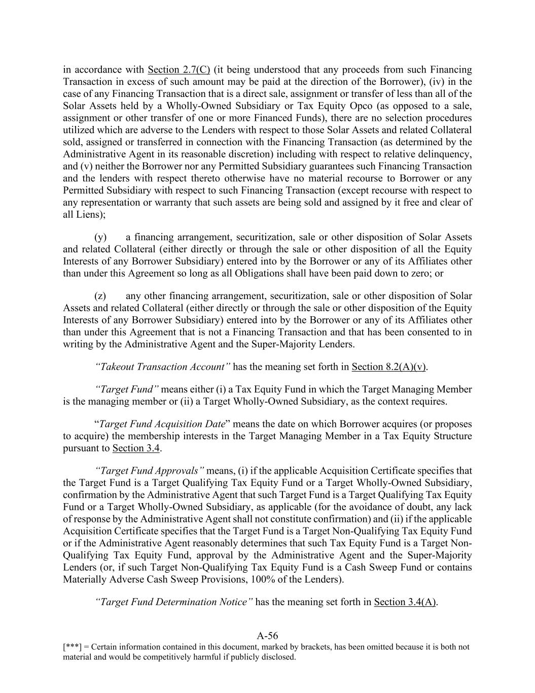 A-56 [***] = Certain information contained in this document, marked by brackets, has been omitted because it is both not material and would be competitively harmful if publicly disclosed. in accordance with Section 2.7(C) (it being understood that any proceeds from such Financing Transaction in excess of such amount may be paid at the direction of the Borrower), (iv) in the case of any Financing Transaction that is a direct sale, assignment or transfer of less than all of the Solar Assets held by a Wholly-Owned Subsidiary or Tax Equity Opco (as opposed to a sale, assignment or other transfer of one or more Financed Funds), there are no selection procedures utilized which are adverse to the Lenders with respect to those Solar Assets and related Collateral sold, assigned or transferred in connection with the Financing Transaction (as determined by the Administrative Agent in its reasonable discretion) including with respect to relative delinquency, and (v) neither the Borrower nor any Permitted Subsidiary guarantees such Financing Transaction and the lenders with respect thereto otherwise have no material recourse to Borrower or any Permitted Subsidiary with respect to such Financing Transaction (except recourse with respect to any representation or warranty that such assets are being sold and assigned by it free and clear of all Liens); (y) a financing arrangement, securitization, sale or other disposition of Solar Assets and related Collateral (either directly or through the sale or other disposition of all the Equity Interests of any Borrower Subsidiary) entered into by the Borrower or any of its Affiliates other than under this Agreement so long as all Obligations shall have been paid down to zero; or (z) any other financing arrangement, securitization, sale or other disposition of Solar Assets and related Collateral (either directly or through the sale or other disposition of the Equity Interests of any Borrower Subsidiary) entered into by the Borrower or any of its Affiliates other than under this Agreement that is not a Financing Transaction and that has been consented to in writing by the Administrative Agent and the Super-Majority Lenders. “Takeout Transaction Account” has the meaning set forth in Section 8.2(A)(v). “Target Fund” means either (i) a Tax Equity Fund in which the Target Managing Member is the managing member or (ii) a Target Wholly-Owned Subsidiary, as the context requires. “Target Fund Acquisition Date” means the date on which Borrower acquires (or proposes to acquire) the membership interests in the Target Managing Member in a Tax Equity Structure pursuant to Section 3.4. “Target Fund Approvals” means, (i) if the applicable Acquisition Certificate specifies that the Target Fund is a Target Qualifying Tax Equity Fund or a Target Wholly-Owned Subsidiary, confirmation by the Administrative Agent that such Target Fund is a Target Qualifying Tax Equity Fund or a Target Wholly-Owned Subsidiary, as applicable (for the avoidance of doubt, any lack of response by the Administrative Agent shall not constitute confirmation) and (ii) if the applicable Acquisition Certificate specifies that the Target Fund is a Target Non-Qualifying Tax Equity Fund or if the Administrative Agent reasonably determines that such Tax Equity Fund is a Target Non- Qualifying Tax Equity Fund, approval by the Administrative Agent and the Super-Majority Lenders (or, if such Target Non-Qualifying Tax Equity Fund is a Cash Sweep Fund or contains Materially Adverse Cash Sweep Provisions, 100% of the Lenders). “Target Fund Determination Notice” has the meaning set forth in Section 3.4(A).