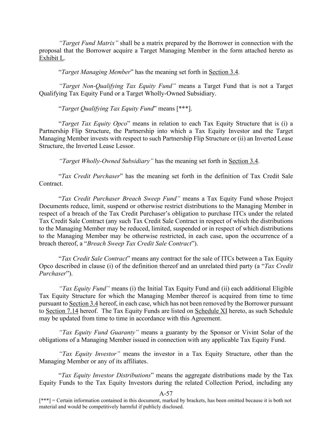 A-57 [***] = Certain information contained in this document, marked by brackets, has been omitted because it is both not material and would be competitively harmful if publicly disclosed. “Target Fund Matrix” shall be a matrix prepared by the Borrower in connection with the proposal that the Borrower acquire a Target Managing Member in the form attached hereto as Exhibit L. “Target Managing Member” has the meaning set forth in Section 3.4. “Target Non-Qualifying Tax Equity Fund” means a Target Fund that is not a Target Qualifying Tax Equity Fund or a Target Wholly-Owned Subsidiary. “Target Qualifying Tax Equity Fund” means [***]. “Target Tax Equity Opco” means in relation to each Tax Equity Structure that is (i) a Partnership Flip Structure, the Partnership into which a Tax Equity Investor and the Target Managing Member invests with respect to such Partnership Flip Structure or (ii) an Inverted Lease Structure, the Inverted Lease Lessor. “Target Wholly-Owned Subsidiary” has the meaning set forth in Section 3.4. “Tax Credit Purchaser” has the meaning set forth in the definition of Tax Credit Sale Contract. “Tax Credit Purchaser Breach Sweep Fund” means a Tax Equity Fund whose Project Documents reduce, limit, suspend or otherwise restrict distributions to the Managing Member in respect of a breach of the Tax Credit Purchaser’s obligation to purchase ITCs under the related Tax Credit Sale Contract (any such Tax Credit Sale Contract in respect of which the distributions to the Managing Member may be reduced, limited, suspended or in respect of which distributions to the Managing Member may be otherwise restricted, in each case, upon the occurrence of a breach thereof, a “Breach Sweep Tax Credit Sale Contract”). “Tax Credit Sale Contract” means any contract for the sale of ITCs between a Tax Equity Opco described in clause (i) of the definition thereof and an unrelated third party (a “Tax Credit Purchaser”). “Tax Equity Fund” means (i) the Initial Tax Equity Fund and (ii) each additional Eligible Tax Equity Structure for which the Managing Member thereof is acquired from time to time pursuant to Section 3.4 hereof, in each case, which has not been removed by the Borrower pursuant to Section 7.14 hereof. The Tax Equity Funds are listed on Schedule XI hereto, as such Schedule may be updated from time to time in accordance with this Agreement. “Tax Equity Fund Guaranty” means a guaranty by the Sponsor or Vivint Solar of the obligations of a Managing Member issued in connection with any applicable Tax Equity Fund. “Tax Equity Investor” means the investor in a Tax Equity Structure, other than the Managing Member or any of its affiliates. “Tax Equity Investor Distributions” means the aggregate distributions made by the Tax Equity Funds to the Tax Equity Investors during the related Collection Period, including any