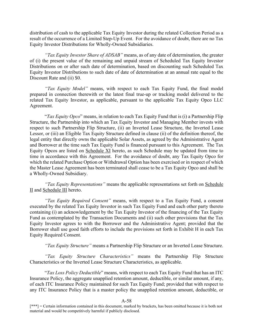 A-58 [***] = Certain information contained in this document, marked by brackets, has been omitted because it is both not material and would be competitively harmful if publicly disclosed. distribution of cash to the applicable Tax Equity Investor during the related Collection Period as a result of the occurrence of a Limited Step-Up Event. For the avoidance of doubt, there are no Tax Equity Investor Distributions for Wholly-Owned Subsidiaries. “Tax Equity Investor Share of ADSAB” means, as of any date of determination, the greater of (i) the present value of the remaining and unpaid stream of Scheduled Tax Equity Investor Distributions on or after such date of determination, based on discounting such Scheduled Tax Equity Investor Distributions to such date of date of determination at an annual rate equal to the Discount Rate and (ii) $0. “Tax Equity Model” means, with respect to each Tax Equity Fund, the final model prepared in connection therewith or the latest final true-up or tracking model delivered to the related Tax Equity Investor, as applicable, pursuant to the applicable Tax Equity Opco LLC Agreement. “Tax Equity Opco” means, in relation to each Tax Equity Fund that is (i) a Partnership Flip Structure, the Partnership into which an Tax Equity Investor and Managing Member invests with respect to such Partnership Flip Structure, (ii) an Inverted Lease Structure, the Inverted Lease Lessor, or (iii) an Eligible Tax Equity Structure defined in clause (ii) of the definition thereof, the legal entity that directly owns the applicable Solar Assets, as agreed by the Administrative Agent and Borrower at the time such Tax Equity Fund is financed pursuant to this Agreement. The Tax Equity Opcos are listed on Schedule XI hereto, as such Schedule may be updated from time to time in accordance with this Agreement. For the avoidance of doubt, any Tax Equity Opco for which the related Purchase Option or Withdrawal Option has been exercised or in respect of which the Master Lease Agreement has been terminated shall cease to be a Tax Equity Opco and shall be a Wholly-Owned Subsidiary. “Tax Equity Representations” means the applicable representations set forth on Schedule II and Schedule III hereto. “Tax Equity Required Consent” means, with respect to a Tax Equity Fund, a consent executed by the related Tax Equity Investor in such Tax Equity Fund and each other party thereto containing (i) an acknowledgement by the Tax Equity Investor of the financing of the Tax Equity Fund as contemplated by the Transaction Documents and (ii) such other provisions that the Tax Equity Investor agrees to with the Borrower and the Administrative Agent; provided that the Borrower shall use good faith efforts to include the provisions set forth in Exhibit H in each Tax Equity Required Consent. “Tax Equity Structure” means a Partnership Flip Structure or an Inverted Lease Structure. “Tax Equity Structure Characteristics” means the Partnership Flip Structure Characteristics or the Inverted Lease Structure Characteristics, as applicable. “Tax Loss Policy Deductible” means, with respect to each Tax Equity Fund that has an ITC Insurance Policy, the aggregate unapplied retention amount, deductible, or similar amount, if any, of each ITC Insurance Policy maintained for such Tax Equity Fund; provided that with respect to any ITC Insurance Policy that is a master policy the unapplied retention amount, deductible, or