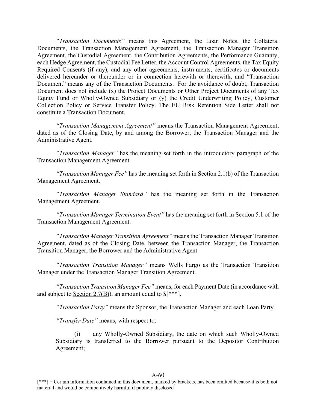 A-60 [***] = Certain information contained in this document, marked by brackets, has been omitted because it is both not material and would be competitively harmful if publicly disclosed. “Transaction Documents” means this Agreement, the Loan Notes, the Collateral Documents, the Transaction Management Agreement, the Transaction Manager Transition Agreement, the Custodial Agreement, the Contribution Agreements, the Performance Guaranty, each Hedge Agreement, the Custodial Fee Letter, the Account Control Agreements, the Tax Equity Required Consents (if any), and any other agreements, instruments, certificates or documents delivered hereunder or thereunder or in connection herewith or therewith, and “Transaction Document” means any of the Transaction Documents. For the avoidance of doubt, Transaction Document does not include (x) the Project Documents or Other Project Documents of any Tax Equity Fund or Wholly-Owned Subsidiary or (y) the Credit Underwriting Policy, Customer Collection Policy or Service Transfer Policy. The EU Risk Retention Side Letter shall not constitute a Transaction Document. “Transaction Management Agreement” means the Transaction Management Agreement, dated as of the Closing Date, by and among the Borrower, the Transaction Manager and the Administrative Agent. “Transaction Manager” has the meaning set forth in the introductory paragraph of the Transaction Management Agreement. “Transaction Manager Fee” has the meaning set forth in Section 2.1(b) of the Transaction Management Agreement. “Transaction Manager Standard” has the meaning set forth in the Transaction Management Agreement. “Transaction Manager Termination Event” has the meaning set forth in Section 5.1 of the Transaction Management Agreement. “Transaction Manager Transition Agreement” means the Transaction Manager Transition Agreement, dated as of the Closing Date, between the Transaction Manager, the Transaction Transition Manager, the Borrower and the Administrative Agent. “Transaction Transition Manager” means Wells Fargo as the Transaction Transition Manager under the Transaction Manager Transition Agreement. “Transaction Transition Manager Fee” means, for each Payment Date (in accordance with and subject to Section 2.7(B)), an amount equal to $[***]. “Transaction Party” means the Sponsor, the Transaction Manager and each Loan Party. “Transfer Date” means, with respect to: (i) any Wholly-Owned Subsidiary, the date on which such Wholly-Owned Subsidiary is transferred to the Borrower pursuant to the Depositor Contribution Agreement;