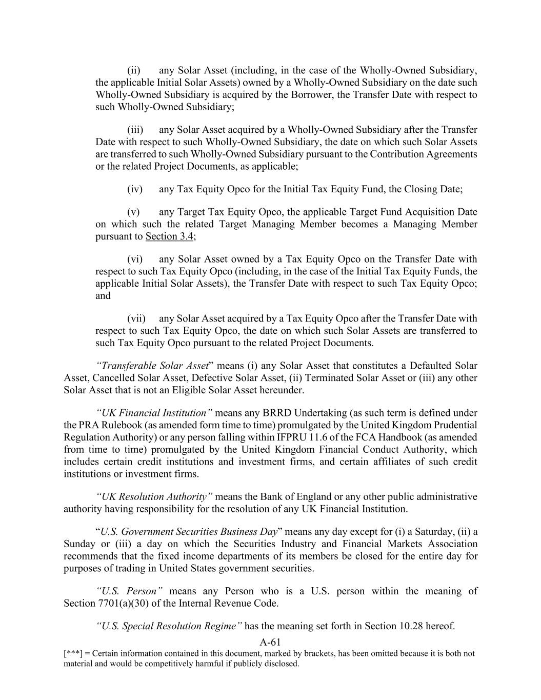 A-61 [***] = Certain information contained in this document, marked by brackets, has been omitted because it is both not material and would be competitively harmful if publicly disclosed. (ii) any Solar Asset (including, in the case of the Wholly-Owned Subsidiary, the applicable Initial Solar Assets) owned by a Wholly-Owned Subsidiary on the date such Wholly-Owned Subsidiary is acquired by the Borrower, the Transfer Date with respect to such Wholly-Owned Subsidiary; (iii) any Solar Asset acquired by a Wholly-Owned Subsidiary after the Transfer Date with respect to such Wholly-Owned Subsidiary, the date on which such Solar Assets are transferred to such Wholly-Owned Subsidiary pursuant to the Contribution Agreements or the related Project Documents, as applicable; (iv) any Tax Equity Opco for the Initial Tax Equity Fund, the Closing Date; (v) any Target Tax Equity Opco, the applicable Target Fund Acquisition Date on which such the related Target Managing Member becomes a Managing Member pursuant to Section 3.4; (vi) any Solar Asset owned by a Tax Equity Opco on the Transfer Date with respect to such Tax Equity Opco (including, in the case of the Initial Tax Equity Funds, the applicable Initial Solar Assets), the Transfer Date with respect to such Tax Equity Opco; and (vii) any Solar Asset acquired by a Tax Equity Opco after the Transfer Date with respect to such Tax Equity Opco, the date on which such Solar Assets are transferred to such Tax Equity Opco pursuant to the related Project Documents. “Transferable Solar Asset” means (i) any Solar Asset that constitutes a Defaulted Solar Asset, Cancelled Solar Asset, Defective Solar Asset, (ii) Terminated Solar Asset or (iii) any other Solar Asset that is not an Eligible Solar Asset hereunder. “UK Financial Institution” means any BRRD Undertaking (as such term is defined under the PRA Rulebook (as amended form time to time) promulgated by the United Kingdom Prudential Regulation Authority) or any person falling within IFPRU 11.6 of the FCA Handbook (as amended from time to time) promulgated by the United Kingdom Financial Conduct Authority, which includes certain credit institutions and investment firms, and certain affiliates of such credit institutions or investment firms. “UK Resolution Authority” means the Bank of England or any other public administrative authority having responsibility for the resolution of any UK Financial Institution. “U.S. Government Securities Business Day” means any day except for (i) a Saturday, (ii) a Sunday or (iii) a day on which the Securities Industry and Financial Markets Association recommends that the fixed income departments of its members be closed for the entire day for purposes of trading in United States government securities. “U.S. Person” means any Person who is a U.S. person within the meaning of Section 7701(a)(30) of the Internal Revenue Code. “U.S. Special Resolution Regime” has the meaning set forth in Section 10.28 hereof.