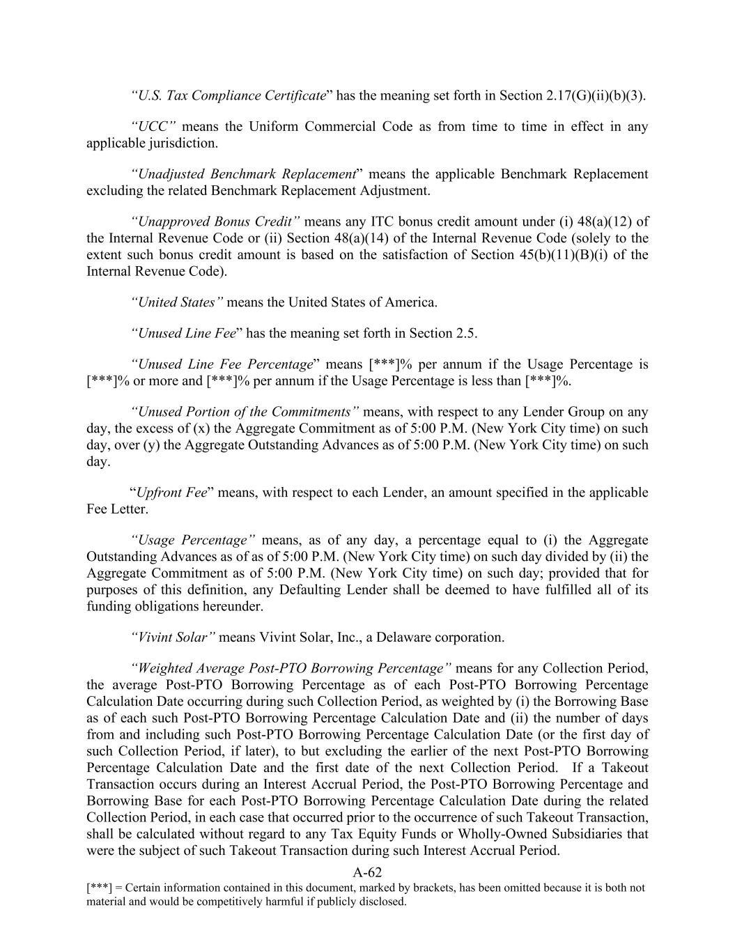 A-62 [***] = Certain information contained in this document, marked by brackets, has been omitted because it is both not material and would be competitively harmful if publicly disclosed. “U.S. Tax Compliance Certificate” has the meaning set forth in Section 2.17(G)(ii)(b)(3). “UCC” means the Uniform Commercial Code as from time to time in effect in any applicable jurisdiction. “Unadjusted Benchmark Replacement” means the applicable Benchmark Replacement excluding the related Benchmark Replacement Adjustment. “Unapproved Bonus Credit” means any ITC bonus credit amount under (i) 48(a)(12) of the Internal Revenue Code or (ii) Section 48(a)(14) of the Internal Revenue Code (solely to the extent such bonus credit amount is based on the satisfaction of Section 45(b)(11)(B)(i) of the Internal Revenue Code). “United States” means the United States of America. “Unused Line Fee” has the meaning set forth in Section 2.5. “Unused Line Fee Percentage” means [***]% per annum if the Usage Percentage is [***]% or more and [***]% per annum if the Usage Percentage is less than [***]%. “Unused Portion of the Commitments” means, with respect to any Lender Group on any day, the excess of (x) the Aggregate Commitment as of 5:00 P.M. (New York City time) on such day, over (y) the Aggregate Outstanding Advances as of 5:00 P.M. (New York City time) on such day. “Upfront Fee” means, with respect to each Lender, an amount specified in the applicable Fee Letter. “Usage Percentage” means, as of any day, a percentage equal to (i) the Aggregate Outstanding Advances as of as of 5:00 P.M. (New York City time) on such day divided by (ii) the Aggregate Commitment as of 5:00 P.M. (New York City time) on such day; provided that for purposes of this definition, any Defaulting Lender shall be deemed to have fulfilled all of its funding obligations hereunder. “Vivint Solar” means Vivint Solar, Inc., a Delaware corporation. “Weighted Average Post-PTO Borrowing Percentage” means for any Collection Period, the average Post-PTO Borrowing Percentage as of each Post-PTO Borrowing Percentage Calculation Date occurring during such Collection Period, as weighted by (i) the Borrowing Base as of each such Post-PTO Borrowing Percentage Calculation Date and (ii) the number of days from and including such Post-PTO Borrowing Percentage Calculation Date (or the first day of such Collection Period, if later), to but excluding the earlier of the next Post-PTO Borrowing Percentage Calculation Date and the first date of the next Collection Period. If a Takeout Transaction occurs during an Interest Accrual Period, the Post-PTO Borrowing Percentage and Borrowing Base for each Post-PTO Borrowing Percentage Calculation Date during the related Collection Period, in each case that occurred prior to the occurrence of such Takeout Transaction, shall be calculated without regard to any Tax Equity Funds or Wholly-Owned Subsidiaries that were the subject of such Takeout Transaction during such Interest Accrual Period.