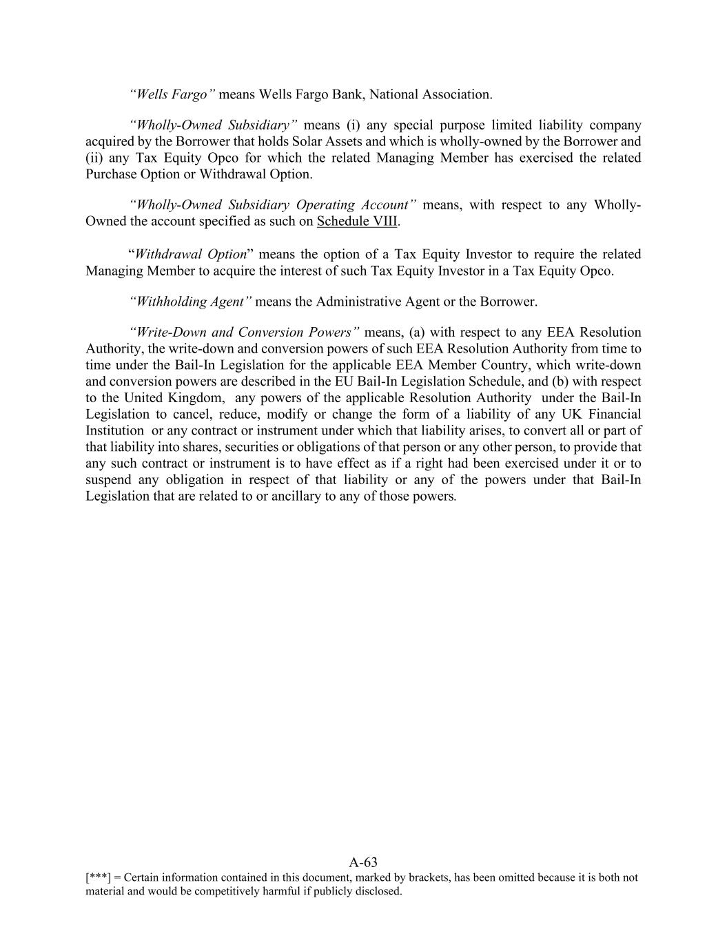 A-63 [***] = Certain information contained in this document, marked by brackets, has been omitted because it is both not material and would be competitively harmful if publicly disclosed. “Wells Fargo” means Wells Fargo Bank, National Association. “Wholly-Owned Subsidiary” means (i) any special purpose limited liability company acquired by the Borrower that holds Solar Assets and which is wholly-owned by the Borrower and (ii) any Tax Equity Opco for which the related Managing Member has exercised the related Purchase Option or Withdrawal Option. “Wholly-Owned Subsidiary Operating Account” means, with respect to any Wholly- Owned the account specified as such on Schedule VIII. “Withdrawal Option” means the option of a Tax Equity Investor to require the related Managing Member to acquire the interest of such Tax Equity Investor in a Tax Equity Opco. “Withholding Agent” means the Administrative Agent or the Borrower. “Write-Down and Conversion Powers” means, (a) with respect to any EEA Resolution Authority, the write-down and conversion powers of such EEA Resolution Authority from time to time under the Bail-In Legislation for the applicable EEA Member Country, which write-down and conversion powers are described in the EU Bail-In Legislation Schedule, and (b) with respect to the United Kingdom, any powers of the applicable Resolution Authority under the Bail-In Legislation to cancel, reduce, modify or change the form of a liability of any UK Financial Institution or any contract or instrument under which that liability arises, to convert all or part of that liability into shares, securities or obligations of that person or any other person, to provide that any such contract or instrument is to have effect as if a right had been exercised under it or to suspend any obligation in respect of that liability or any of the powers under that Bail-In Legislation that are related to or ancillary to any of those powers.