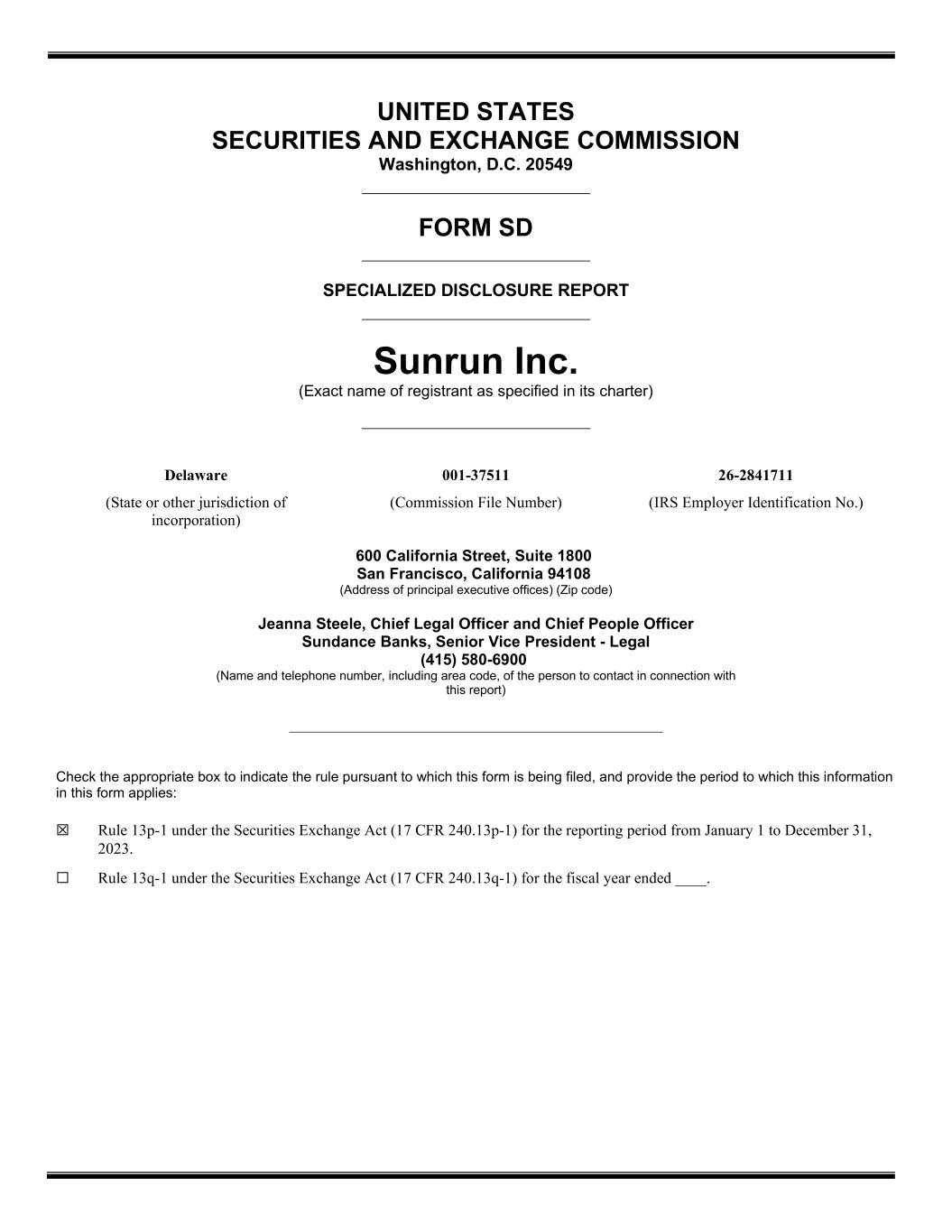 UNITED STATES SECURITIES AND EXCHANGE COMMISSION Washington, D.C. 20549 FORM SD SPECIALIZED DISCLOSURE REPORT Sunrun Inc. (Exact name of registrant as specified in its charter) Delaware 001-37511 26-2841711 (State or other jurisdiction of incorporation) (Commission File Number) (IRS Employer Identification No.) 600 California Street, Suite 1800 San Francisco, California 94108 (Address of principal executive offices) (Zip code) Jeanna Steele, Chief Legal Officer and Chief People Officer Sundance Banks, Senior Vice President - Legal (415) 580-6900 (Name and telephone number, including area code, of the person to contact in connection with this report) ________________________________________________ Check the appropriate box to indicate the rule pursuant to which this form is being filed, and provide the period to which this information in this form applies: ☒ Rule 13p-1 under the Securities Exchange Act (17 CFR 240.13p-1) for the reporting period from January 1 to December 31, 2023. ☐ Rule 13q-1 under the Securities Exchange Act (17 CFR 240.13q-1) for the fiscal year ended ____.