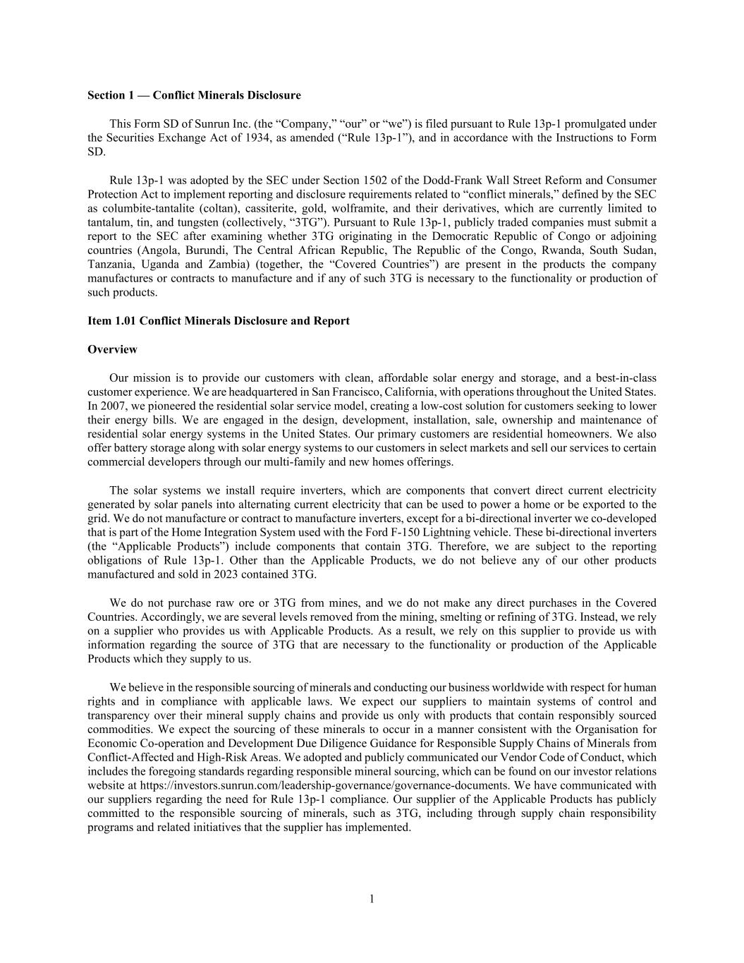 1 Section 1 — Conflict Minerals Disclosure This Form SD of Sunrun Inc. (the “Company,” “our” or “we”) is filed pursuant to Rule 13p-1 promulgated under the Securities Exchange Act of 1934, as amended (“Rule 13p-1”), and in accordance with the Instructions to Form SD. Rule 13p-1 was adopted by the SEC under Section 1502 of the Dodd-Frank Wall Street Reform and Consumer Protection Act to implement reporting and disclosure requirements related to “conflict minerals,” defined by the SEC as columbite-tantalite (coltan), cassiterite, gold, wolframite, and their derivatives, which are currently limited to tantalum, tin, and tungsten (collectively, “3TG”). Pursuant to Rule 13p-1, publicly traded companies must submit a report to the SEC after examining whether 3TG originating in the Democratic Republic of Congo or adjoining countries (Angola, Burundi, The Central African Republic, The Republic of the Congo, Rwanda, South Sudan, Tanzania, Uganda and Zambia) (together, the “Covered Countries”) are present in the products the company manufactures or contracts to manufacture and if any of such 3TG is necessary to the functionality or production of such products. Item 1.01 Conflict Minerals Disclosure and Report Overview Our mission is to provide our customers with clean, affordable solar energy and storage, and a best-in-class customer experience. We are headquartered in San Francisco, California, with operations throughout the United States. In 2007, we pioneered the residential solar service model, creating a low-cost solution for customers seeking to lower their energy bills. We are engaged in the design, development, installation, sale, ownership and maintenance of residential solar energy systems in the United States. Our primary customers are residential homeowners. We also offer battery storage along with solar energy systems to our customers in select markets and sell our services to certain commercial developers through our multi-family and new homes offerings. The solar systems we install require inverters, which are components that convert direct current electricity generated by solar panels into alternating current electricity that can be used to power a home or be exported to the grid. We do not manufacture or contract to manufacture inverters, except for a bi-directional inverter we co-developed that is part of the Home Integration System used with the Ford F-150 Lightning vehicle. These bi-directional inverters (the “Applicable Products”) include components that contain 3TG. Therefore, we are subject to the reporting obligations of Rule 13p-1. Other than the Applicable Products, we do not believe any of our other products manufactured and sold in 2023 contained 3TG. We do not purchase raw ore or 3TG from mines, and we do not make any direct purchases in the Covered Countries. Accordingly, we are several levels removed from the mining, smelting or refining of 3TG. Instead, we rely on a supplier who provides us with Applicable Products. As a result, we rely on this supplier to provide us with information regarding the source of 3TG that are necessary to the functionality or production of the Applicable Products which they supply to us. We believe in the responsible sourcing of minerals and conducting our business worldwide with respect for human rights and in compliance with applicable laws. We expect our suppliers to maintain systems of control and transparency over their mineral supply chains and provide us only with products that contain responsibly sourced commodities. We expect the sourcing of these minerals to occur in a manner consistent with the Organisation for Economic Co-operation and Development Due Diligence Guidance for Responsible Supply Chains of Minerals from Conflict-Affected and High-Risk Areas. We adopted and publicly communicated our Vendor Code of Conduct, which includes the foregoing standards regarding responsible mineral sourcing, which can be found on our investor relations website at https://investors.sunrun.com/leadership-governance/governance-documents. We have communicated with our suppliers regarding the need for Rule 13p-1 compliance. Our supplier of the Applicable Products has publicly committed to the responsible sourcing of minerals, such as 3TG, including through supply chain responsibility programs and related initiatives that the supplier has implemented.