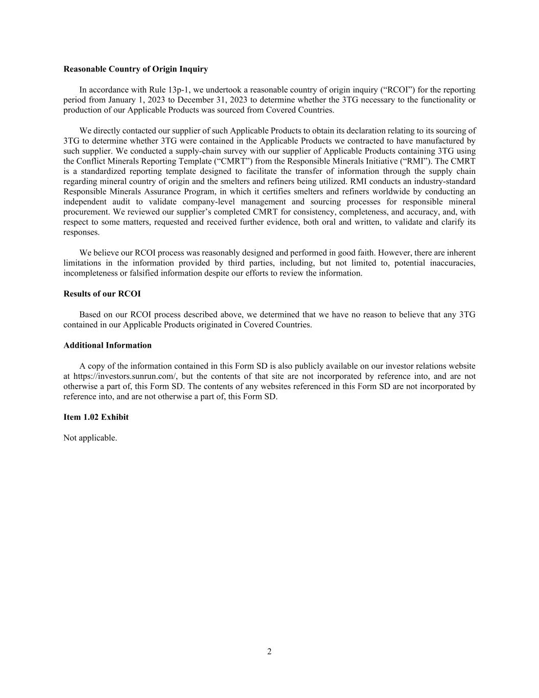 2 Reasonable Country of Origin Inquiry In accordance with Rule 13p-1, we undertook a reasonable country of origin inquiry (“RCOI”) for the reporting period from January 1, 2023 to December 31, 2023 to determine whether the 3TG necessary to the functionality or production of our Applicable Products was sourced from Covered Countries. We directly contacted our supplier of such Applicable Products to obtain its declaration relating to its sourcing of 3TG to determine whether 3TG were contained in the Applicable Products we contracted to have manufactured by such supplier. We conducted a supply-chain survey with our supplier of Applicable Products containing 3TG using the Conflict Minerals Reporting Template (“CMRT”) from the Responsible Minerals Initiative (“RMI”). The CMRT is a standardized reporting template designed to facilitate the transfer of information through the supply chain regarding mineral country of origin and the smelters and refiners being utilized. RMI conducts an industry-standard Responsible Minerals Assurance Program, in which it certifies smelters and refiners worldwide by conducting an independent audit to validate company-level management and sourcing processes for responsible mineral procurement. We reviewed our supplier’s completed CMRT for consistency, completeness, and accuracy, and, with respect to some matters, requested and received further evidence, both oral and written, to validate and clarify its responses. We believe our RCOI process was reasonably designed and performed in good faith. However, there are inherent limitations in the information provided by third parties, including, but not limited to, potential inaccuracies, incompleteness or falsified information despite our efforts to review the information. Results of our RCOI Based on our RCOI process described above, we determined that we have no reason to believe that any 3TG contained in our Applicable Products originated in Covered Countries. Additional Information A copy of the information contained in this Form SD is also publicly available on our investor relations website at https://investors.sunrun.com/, but the contents of that site are not incorporated by reference into, and are not otherwise a part of, this Form SD. The contents of any websites referenced in this Form SD are not incorporated by reference into, and are not otherwise a part of, this Form SD. Item 1.02 Exhibit Not applicable.