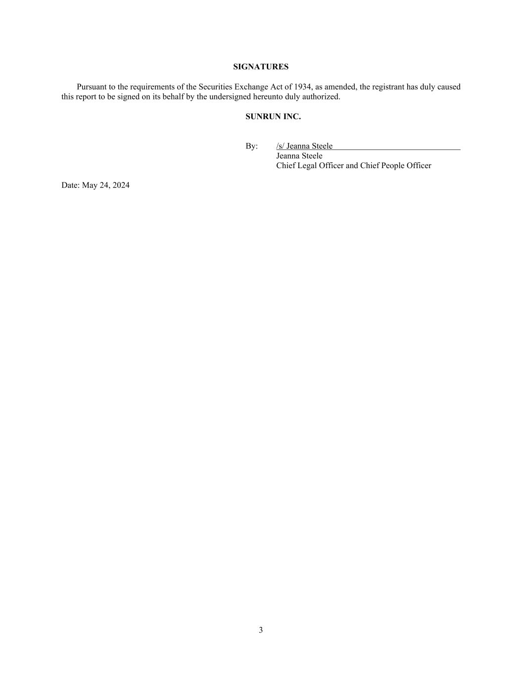 3 SIGNATURES Pursuant to the requirements of the Securities Exchange Act of 1934, as amended, the registrant has duly caused this report to be signed on its behalf by the undersigned hereunto duly authorized. SUNRUN INC. By: /s/ Jeanna Steele Jeanna Steele Chief Legal Officer and Chief People Officer Date: May 24, 2024