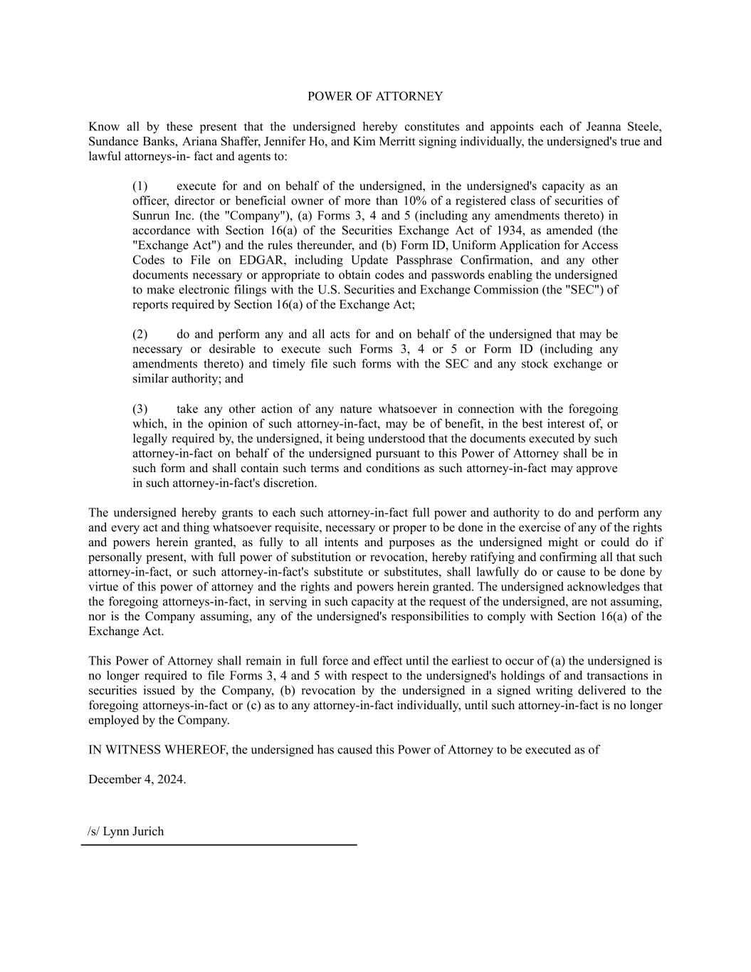 POWER OF ATTORNEY Know all by these present that the undersigned hereby constitutes and appoints each of Jeanna Steele, Sundance Banks, Ariana Shaffer, Jennifer Ho, and Kim Merritt signing individually, the undersigned's true and lawful attorneys-in- fact and agents to: (1) execute for and on behalf of the undersigned, in the undersigned's capacity as an officer, director or beneficial owner of more than 10% of a registered class of securities of Sunrun Inc. (the "Company"), (a) Forms 3, 4 and 5 (including any amendments thereto) in accordance with Section 16(a) of the Securities Exchange Act of 1934, as amended (the "Exchange Act") and the rules thereunder, and (b) Form ID, Uniform Application for Access Codes to File on EDGAR, including Update Passphrase Confirmation, and any other documents necessary or appropriate to obtain codes and passwords enabling the undersigned to make electronic filings with the U.S. Securities and Exchange Commission (the "SEC") of reports required by Section 16(a) of the Exchange Act; (2) do and perform any and all acts for and on behalf of the undersigned that may be necessary or desirable to execute such Forms 3, 4 or 5 or Form ID (including any amendments thereto) and timely file such forms with the SEC and any stock exchange or similar authority; and (3) take any other action of any nature whatsoever in connection with the foregoing which, in the opinion of such attorney-in-fact, may be of benefit, in the best interest of, or legally required by, the undersigned, it being understood that the documents executed by such attorney-in-fact on behalf of the undersigned pursuant to this Power of Attorney shall be in such form and shall contain such terms and conditions as such attorney-in-fact may approve in such attorney-in-fact's discretion. The undersigned hereby grants to each such attorney-in-fact full power and authority to do and perform any and every act and thing whatsoever requisite, necessary or proper to be done in the exercise of any of the rights and powers herein granted, as fully to all intents and purposes as the undersigned might or could do if personally present, with full power of substitution or revocation, hereby ratifying and confirming all that such attorney-in-fact, or such attorney-in-fact's substitute or substitutes, shall lawfully do or cause to be done by virtue of this power of attorney and the rights and powers herein granted. The undersigned acknowledges that the foregoing attorneys-in-fact, in serving in such capacity at the request of the undersigned, are not assuming, nor is the Company assuming, any of the undersigned's responsibilities to comply with Section 16(a) of the Exchange Act. This Power of Attorney shall remain in full force and effect until the earliest to occur of (a) the undersigned is no longer required to file Forms 3, 4 and 5 with respect to the undersigned's holdings of and transactions in securities issued by the Company, (b) revocation by the undersigned in a signed writing delivered to the foregoing attorneys-in-fact or (c) as to any attorney-in-fact individually, until such attorney-in-fact is no longer employed by the Company. IN WITNESS WHEREOF, the undersigned has caused this Power of Attorney to be executed as of December 4, 2024. /s/ Lynn Jurich
