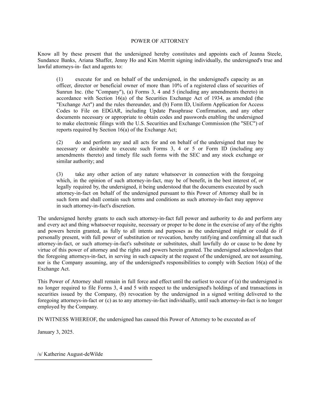 POWER OF ATTORNEY Know all by these present that the undersigned hereby constitutes and appoints each of Jeanna Steele, Sundance Banks, Ariana Shaffer, Jenny Ho and Kim Merritt signing individually, the undersigned's true and lawful attorneys-in- fact and agents to: (1) execute for and on behalf of the undersigned, in the undersigned's capacity as an officer, director or beneficial owner of more than 10% of a registered class of securities of Sunrun Inc. (the "Company"), (a) Forms 3, 4 and 5 (including any amendments thereto) in accordance with Section 16(a) of the Securities Exchange Act of 1934, as amended (the "Exchange Act") and the rules thereunder, and (b) Form ID, Uniform Application for Access Codes to File on EDGAR, including Update Passphrase Confirmation, and any other documents necessary or appropriate to obtain codes and passwords enabling the undersigned to make electronic filings with the U.S. Securities and Exchange Commission (the "SEC") of reports required by Section 16(a) of the Exchange Act; (2) do and perform any and all acts for and on behalf of the undersigned that may be necessary or desirable to execute such Forms 3, 4 or 5 or Form ID (including any amendments thereto) and timely file such forms with the SEC and any stock exchange or similar authority; and (3) take any other action of any nature whatsoever in connection with the foregoing which, in the opinion of such attorney-in-fact, may be of benefit, in the best interest of, or legally required by, the undersigned, it being understood that the documents executed by such attorney-in-fact on behalf of the undersigned pursuant to this Power of Attorney shall be in such form and shall contain such terms and conditions as such attorney-in-fact may approve in such attorney-in-fact's discretion. The undersigned hereby grants to each such attorney-in-fact full power and authority to do and perform any and every act and thing whatsoever requisite, necessary or proper to be done in the exercise of any of the rights and powers herein granted, as fully to all intents and purposes as the undersigned might or could do if personally present, with full power of substitution or revocation, hereby ratifying and confirming all that such attorney-in-fact, or such attorney-in-fact's substitute or substitutes, shall lawfully do or cause to be done by virtue of this power of attorney and the rights and powers herein granted. The undersigned acknowledges that the foregoing attorneys-in-fact, in serving in such capacity at the request of the undersigned, are not assuming, nor is the Company assuming, any of the undersigned's responsibilities to comply with Section 16(a) of the Exchange Act. This Power of Attorney shall remain in full force and effect until the earliest to occur of (a) the undersigned is no longer required to file Forms 3, 4 and 5 with respect to the undersigned's holdings of and transactions in securities issued by the Company, (b) revocation by the undersigned in a signed writing delivered to the foregoing attorneys-in-fact or (c) as to any attorney-in-fact individually, until such attorney-in-fact is no longer employed by the Company. IN WITNESS WHEREOF, the undersigned has caused this Power of Attorney to be executed as of January 3, 2025. /s/ Katherine August-deWilde