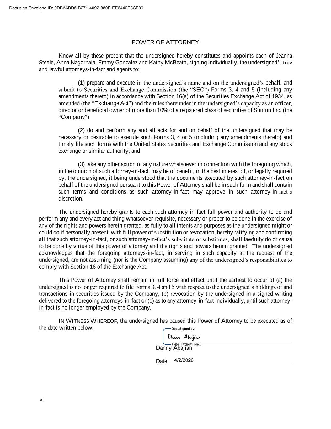 -/0 POWER OF ATTORNEY Know all by these present that the undersigned hereby constitutes and appoints each of Jeanna Steele, Anna Nagornaia, Emmy Gonzalez and Kathy McBeath, signing individually, the undersigned’s true and lawful attorneys-in-fact and agents to: (1) prepare and execute in the undersigned’s name and on the undersigned’s behalf, and submit to Securities and Exchange Commission (the “SEC”) Forms 3, 4 and 5 (including any amendments thereto) in accordance with Section 16(a) of the Securities Exchange Act of 1934, as amended (the “Exchange Act”) and the rules thereunder in the undersigned’s capacity as an officer, director or beneficial owner of more than 10% of a registered class of securities of Sunrun Inc. (the “Company”); (2) do and perform any and all acts for and on behalf of the undersigned that may be necessary or desirable to execute such Forms 3, 4 or 5 (including any amendments thereto) and timely file such forms with the United States Securities and Exchange Commission and any stock exchange or similar authority; and (3) take any other action of any nature whatsoever in connection with the foregoing which, in the opinion of such attorney-in-fact, may be of benefit, in the best interest of, or legally required by, the undersigned, it being understood that the documents executed by such attorney-in-fact on behalf of the undersigned pursuant to this Power of Attorney shall be in such form and shall contain such terms and conditions as such attorney-in-fact may approve in such attorney-in-fact’s discretion. The undersigned hereby grants to each such attorney-in-fact full power and authority to do and perform any and every act and thing whatsoever requisite, necessary or proper to be done in the exercise of any of the rights and powers herein granted, as fully to all intents and purposes as the undersigned might or could do if personally present, with full power of substitution or revocation, hereby ratifying and confirming all that such attorney-in-fact, or such attorney-in-fact’s substitute or substitutes, shall lawfully do or cause to be done by virtue of this power of attorney and the rights and powers herein granted. The undersigned acknowledges that the foregoing attorneys-in-fact, in serving in such capacity at the request of the undersigned, are not assuming (nor is the Company assuming) any of the undersigned’s responsibilities to comply with Section 16 of the Exchange Act. This Power of Attorney shall remain in full force and effect until the earliest to occur of (a) the undersigned is no longer required to file Forms 3, 4 and 5 with respect to the undersigned’s holdings of and transactions in securities issued by the Company, (b) revocation by the undersigned in a signed writing delivered to the foregoing attorneys-in-fact or (c) as to any attorney-in-fact individually, until such attorney- in-fact is no longer employed by the Company. IN WITNESS WHEREOF, the undersigned has caused this Power of Attorney to be executed as of the date written below. Danny Abajian Date: Docusign Envelope ID: 9DBA6BD5-B271-4092-880E-EE6440E8CF99 4/2/2026